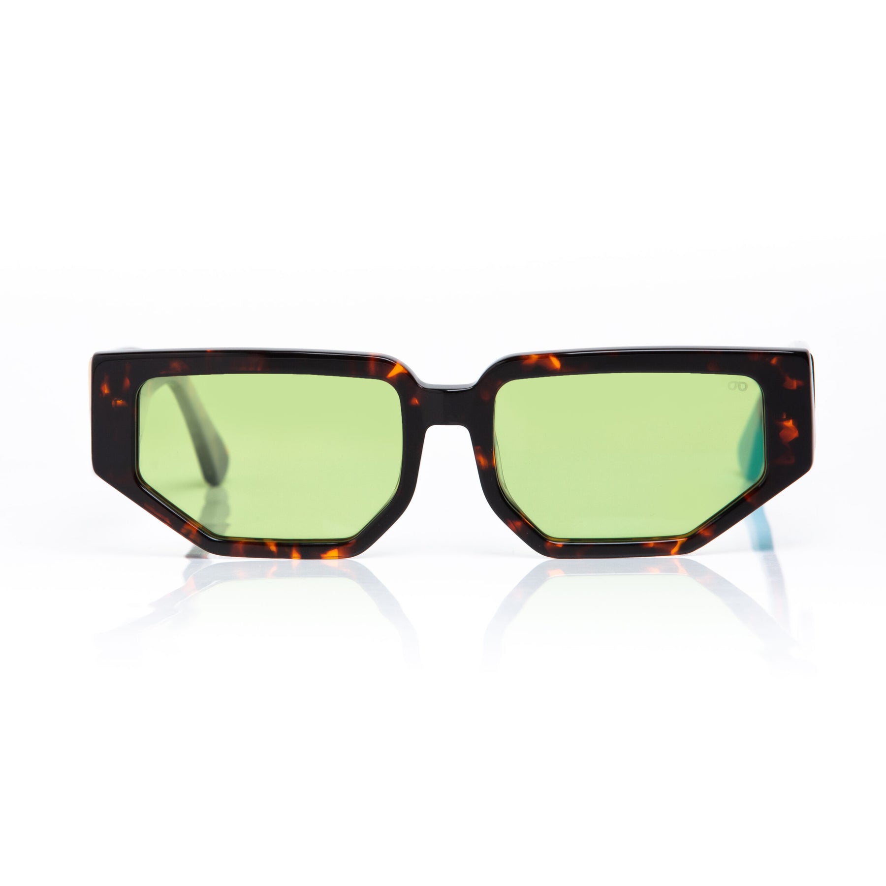 Lentes de sol fabricados en acetato con frente y patillas carey brillo. Detalles de diseño en patillas. Cristal verde con protección UV 400 y polarizado. Modelo genderless & ageless.