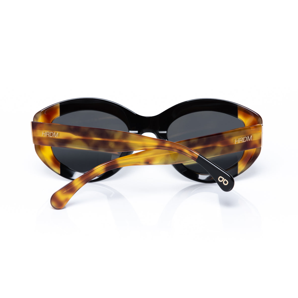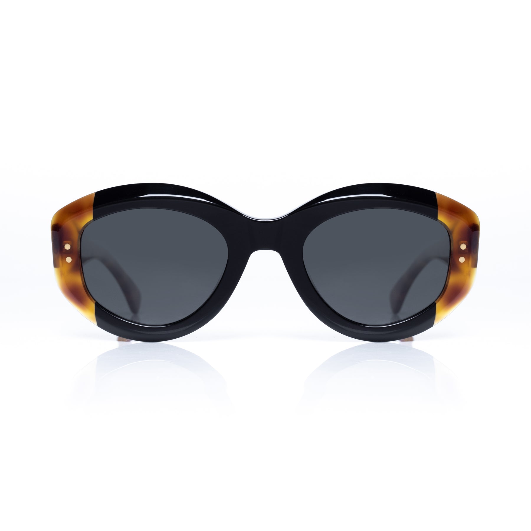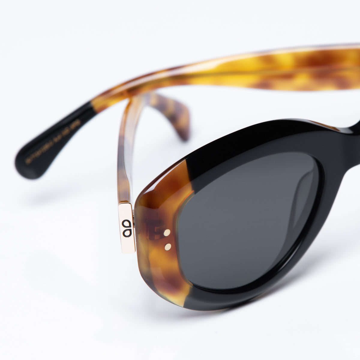 Lentes de sol fabricados en acetato con frente negro y patillas carey brillo. Detalles de diseño en patillas. Cristal gris compacto con protección UV 400 y polarizado. Modelo genderless & ageless.