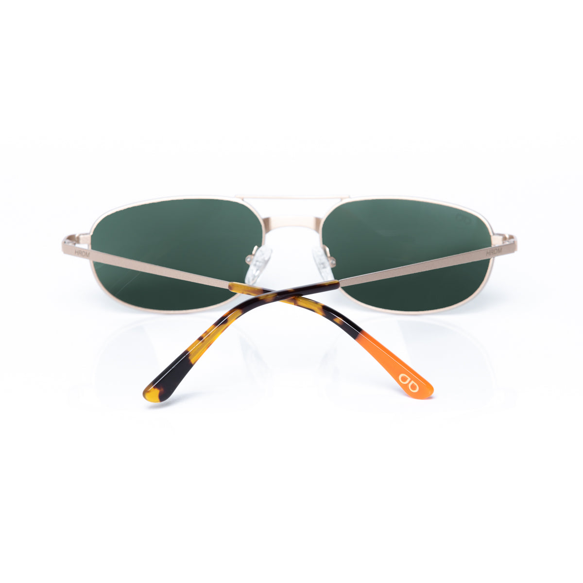 Lentes de sol fabricados en metal con frente y patillas dorado mate. Detalles de diseño en patillas. Cristal verde G-15 con protección UV 400 y polarizado. Modelo genderless & ageless