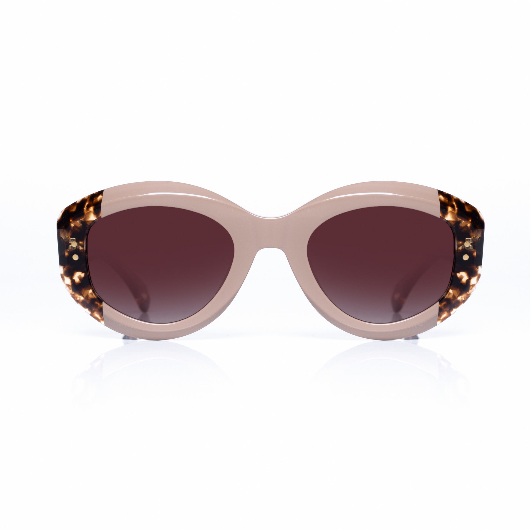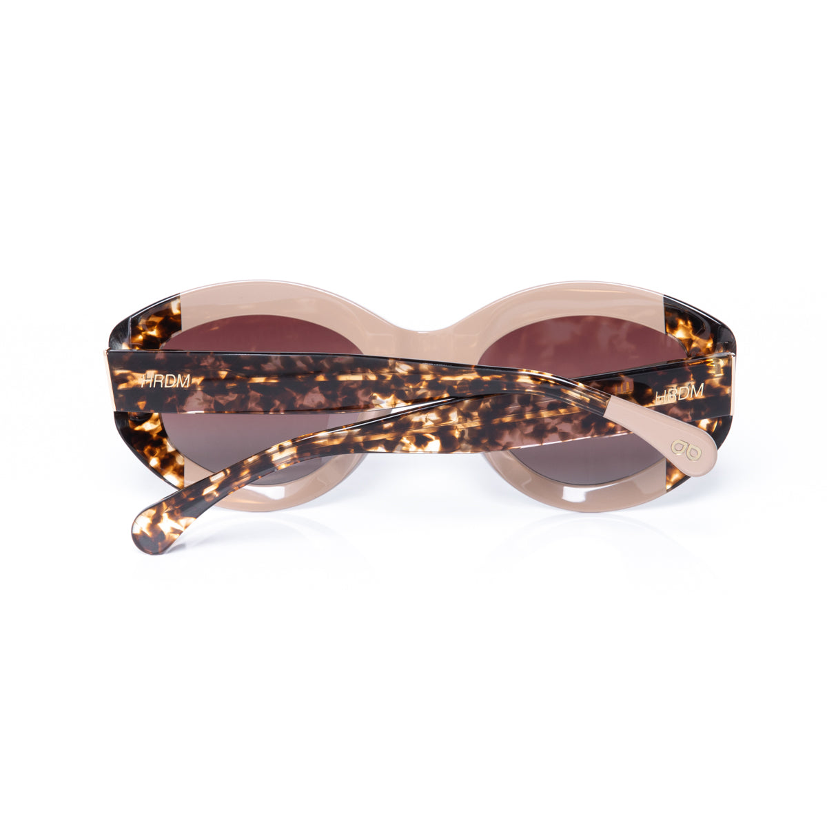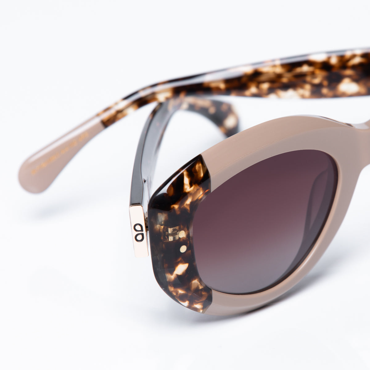 Lentes de sol fabricados en acetato con frente visón y patillas carey brillo. Detalles de diseño en patillas. Cristal sepia degradé con protección UV 400 y polarizado. Modelo genderless & ageless.