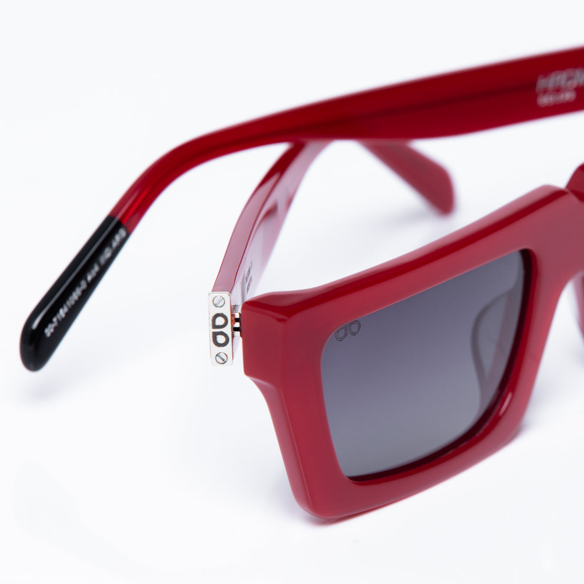 Lentes de sol fabricados en acetato con frente y patillas rojo brillo. Detalles de diseño en patillas. Cristal gris degradé con protección UV 400 y polarizado. Modelo genderless & ageless.