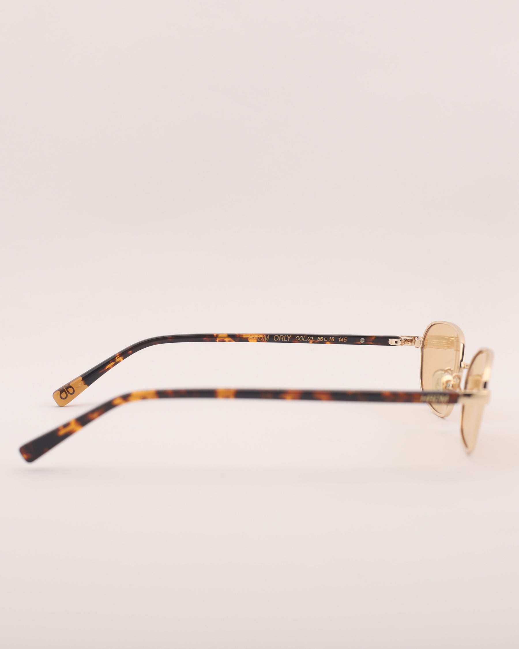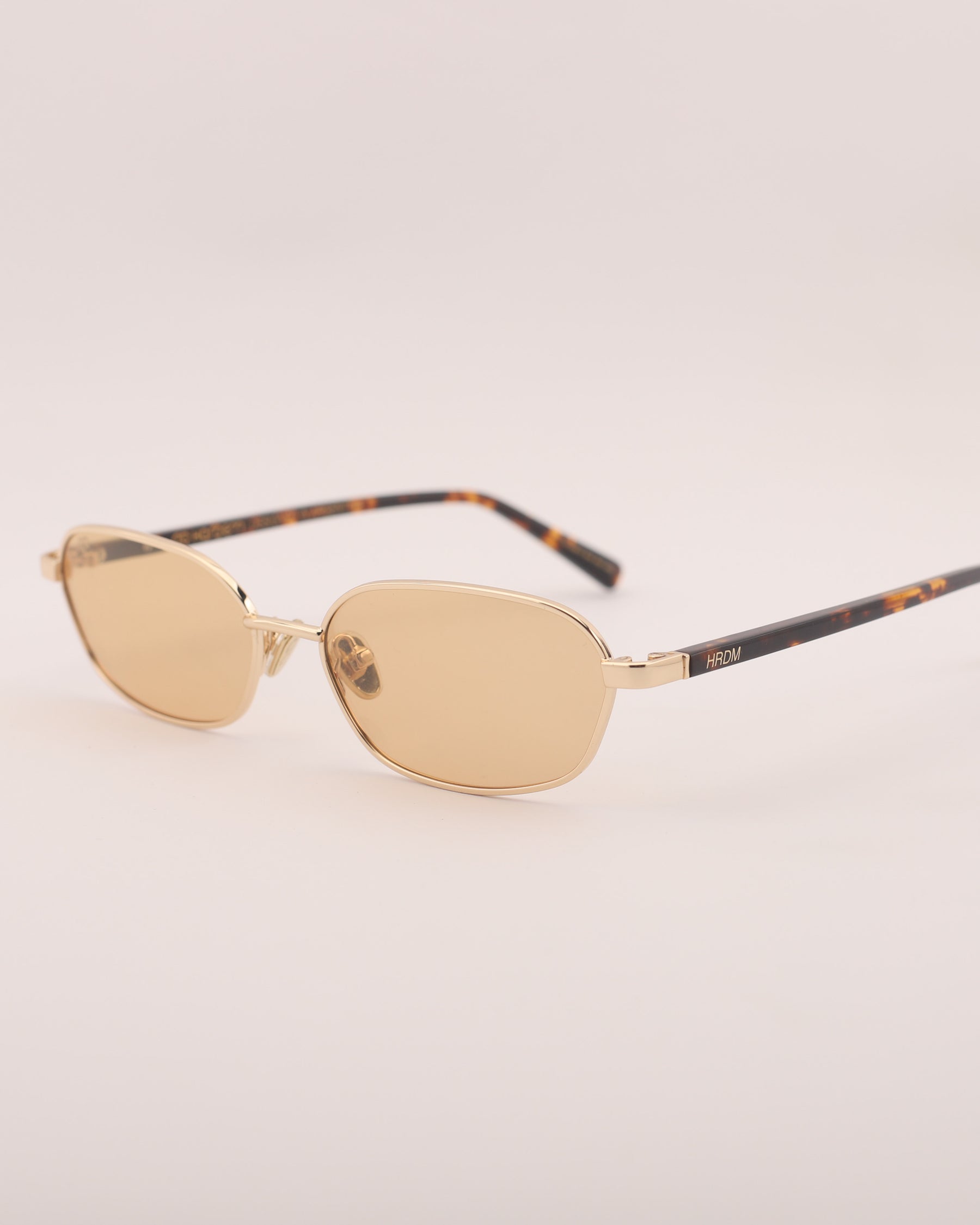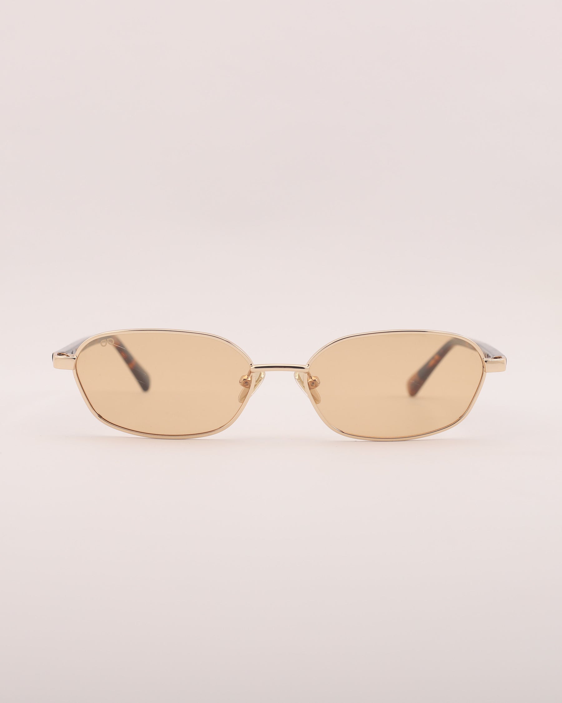Lentes de sol fabricados en metal con frente dorado brillo y patilla carey brillo. Cristal marrón claro compacto con protección UV 400 y polarizado.