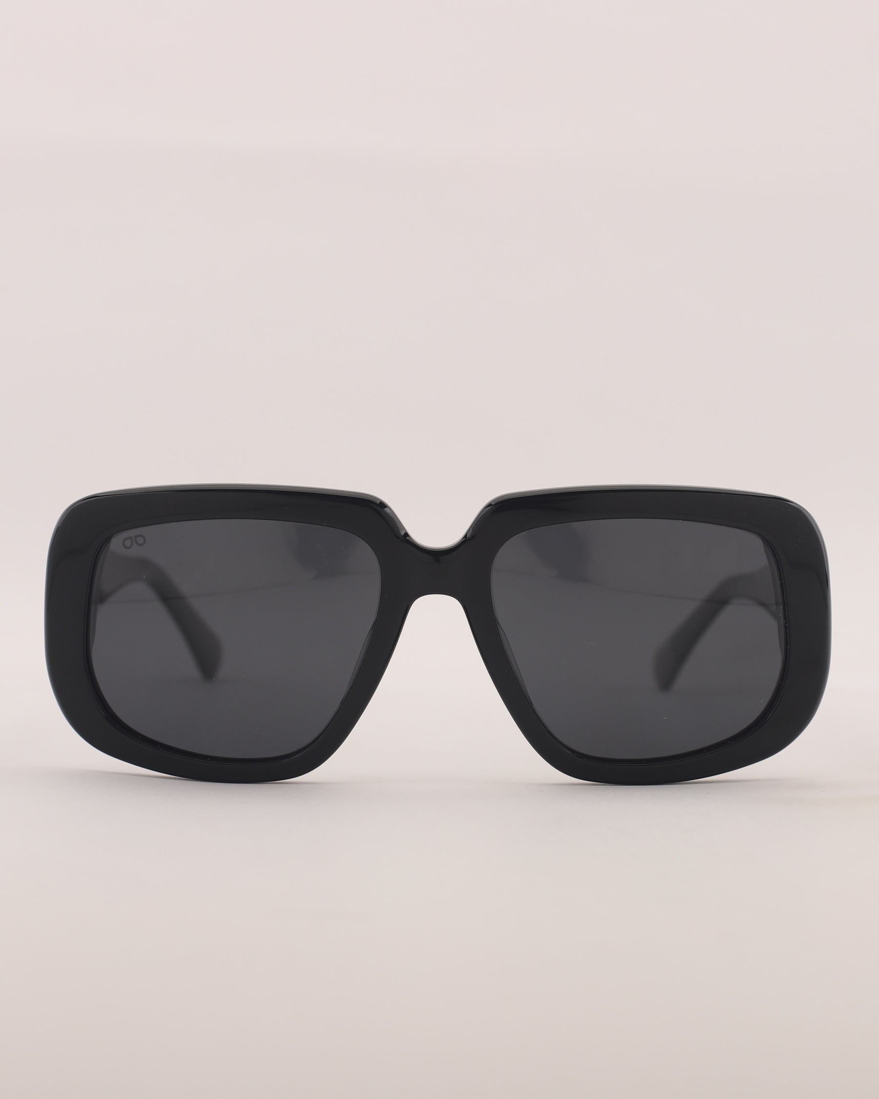 Lentes de sol fabricados en acetato con frente y patillas negro brillo. Cristal gris compacto con protección UV 400 y polarizado.