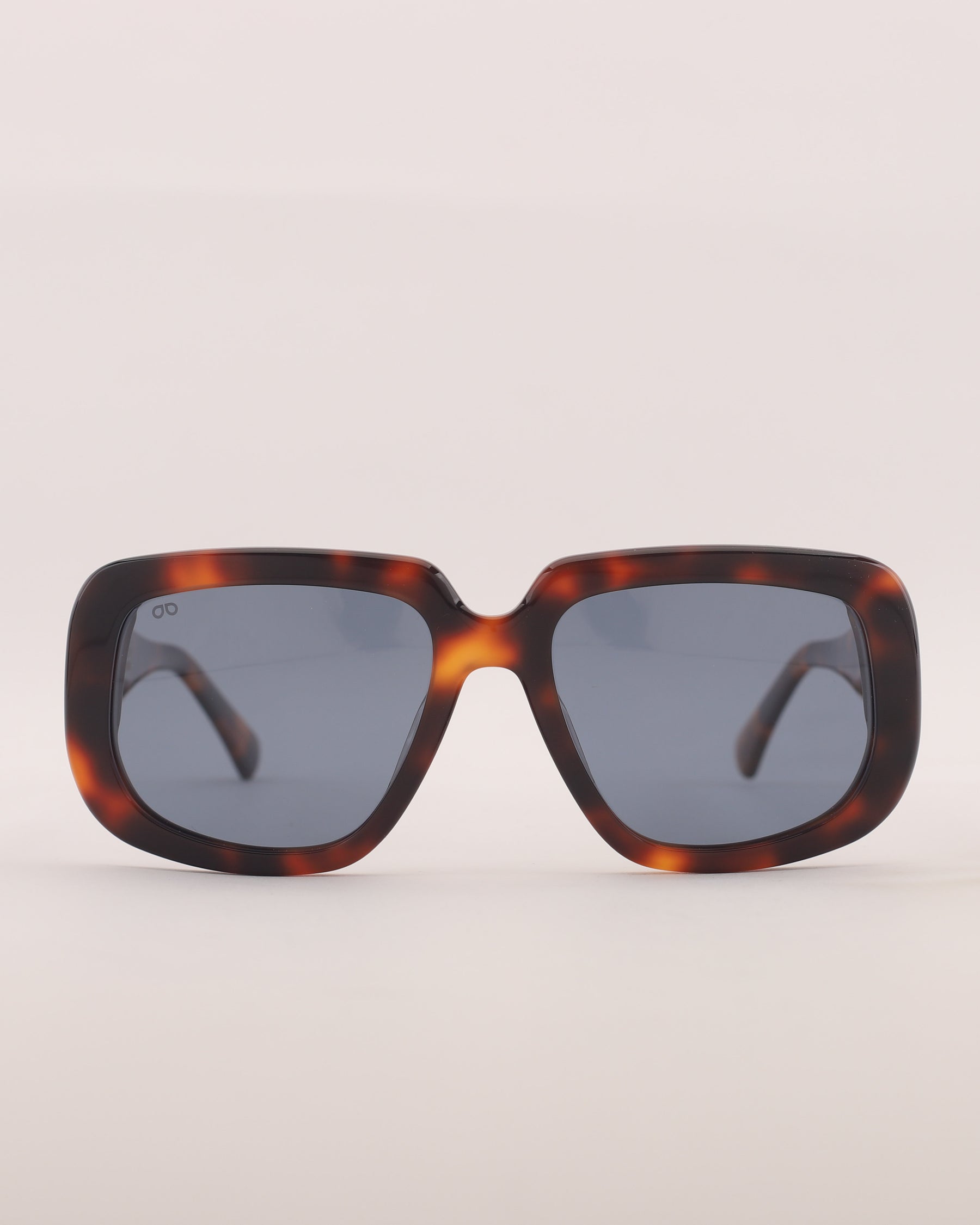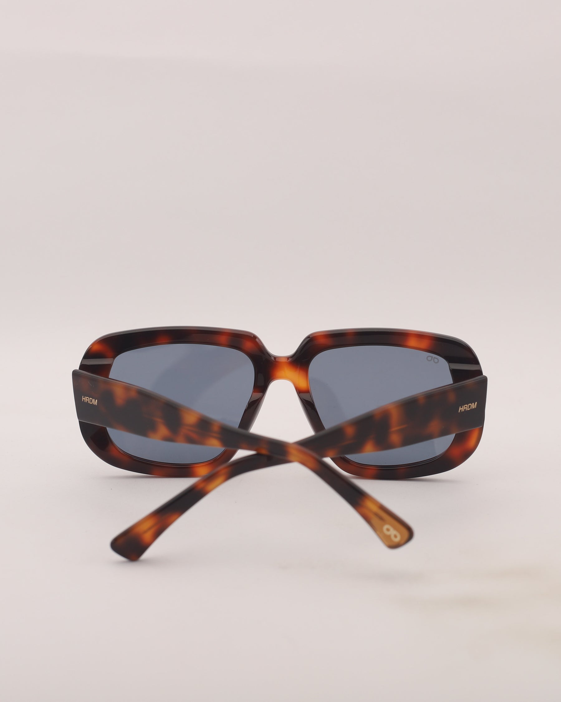 Lentes de sol fabricados en acetato con frente y patillas carey brillo. Cristal gris azulado compacto con protección UV 400 y polarizado.