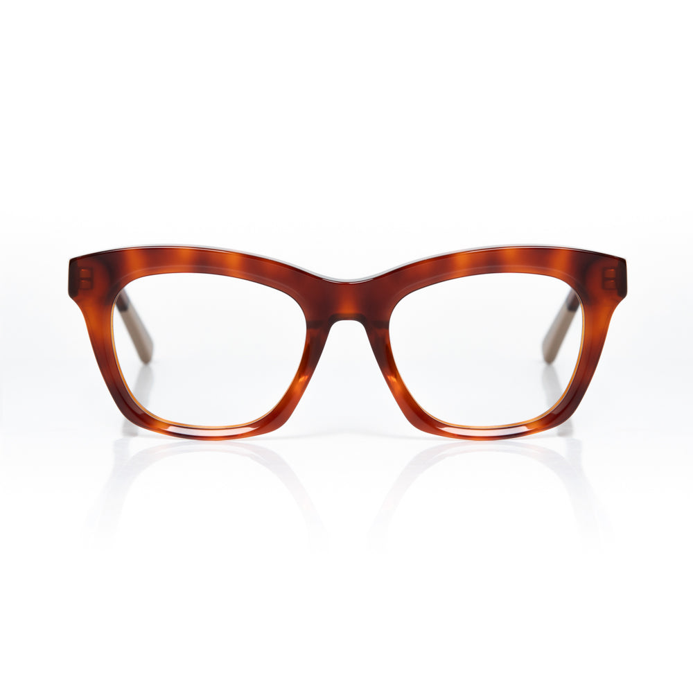 Marco de receta fabricado en acetato con frente y patillas carey brillo. Lentilla de presentación transparente.