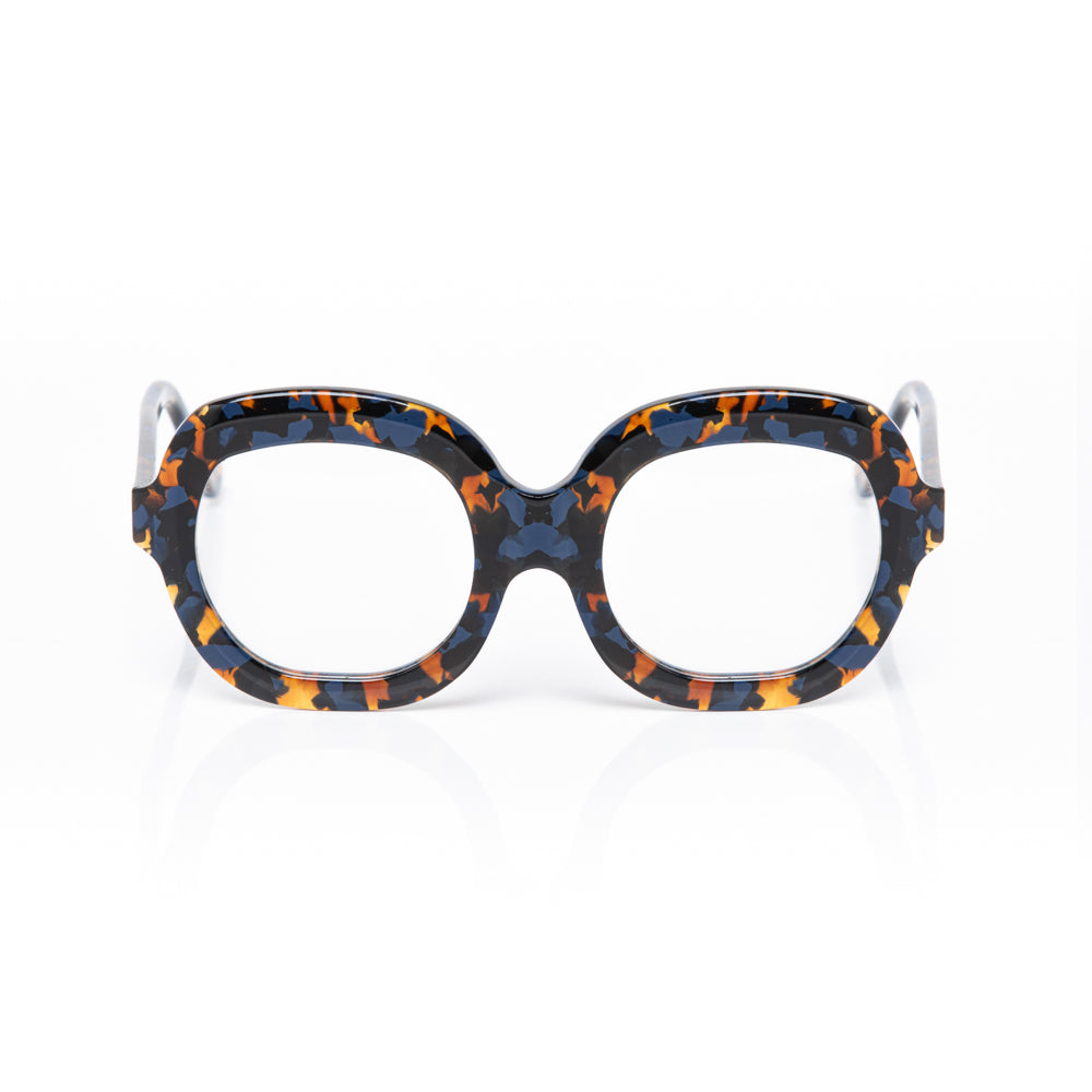 Marco de receta fabricado en acetato con frente y patillas carey con vetas azul brillo. Lentilla de presentación transparente.