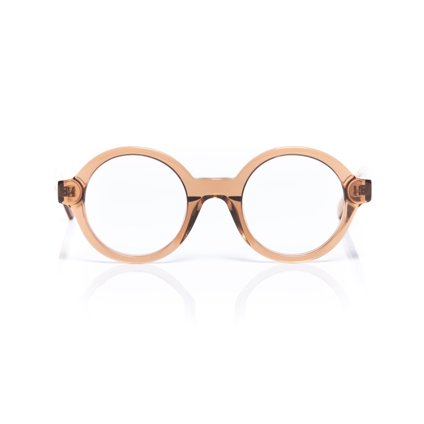 Marco de receta fabricado en acetato con frente y patillas ámbar translúcido brillo. Lentilla de presentación transparente.