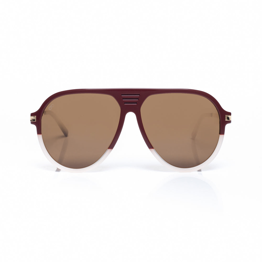 Lentes de sol fabricados en acetato con frente bicolor violeta y blanco brillo y patillas metal dorado. Cristal sepia compacto con protección UV 400 y polarizado. Modelo genderless & ageless.