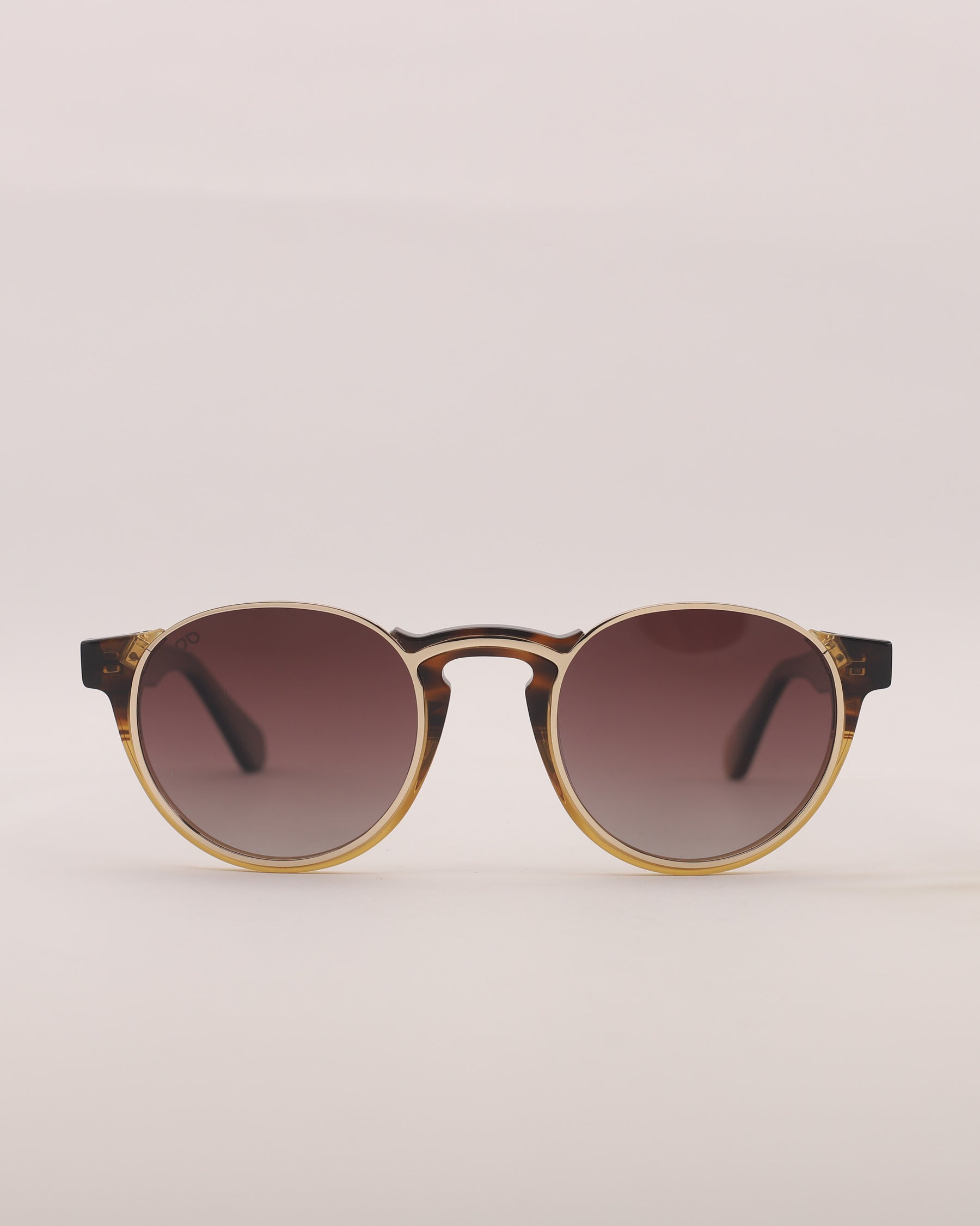 Lentes de sol fabricados en acetato y metal con frente bicolor carey y caramelo brillo con aro dorado y patillas carey brillo. Cristal sepia degradé con protección UV 400 y polarizado.