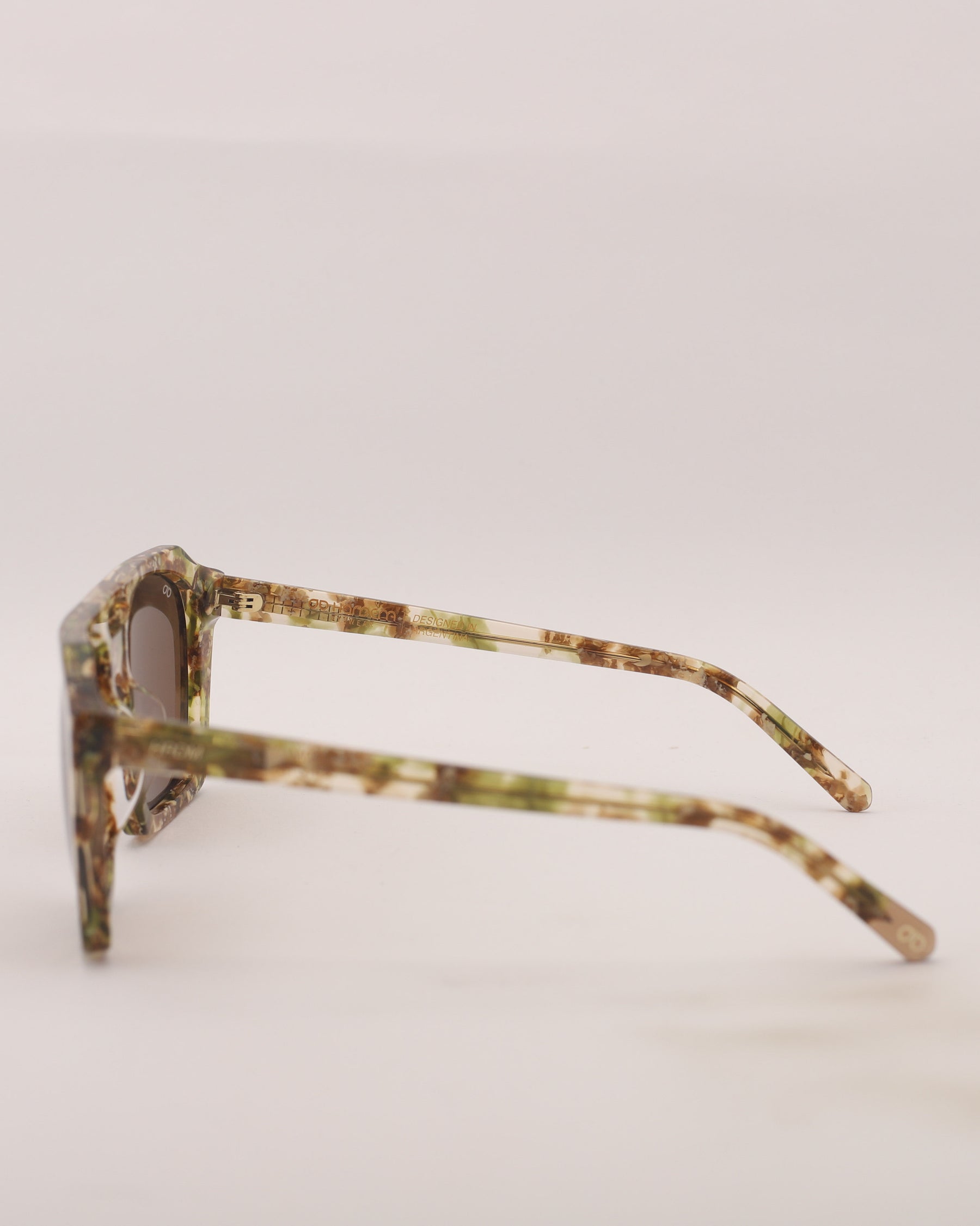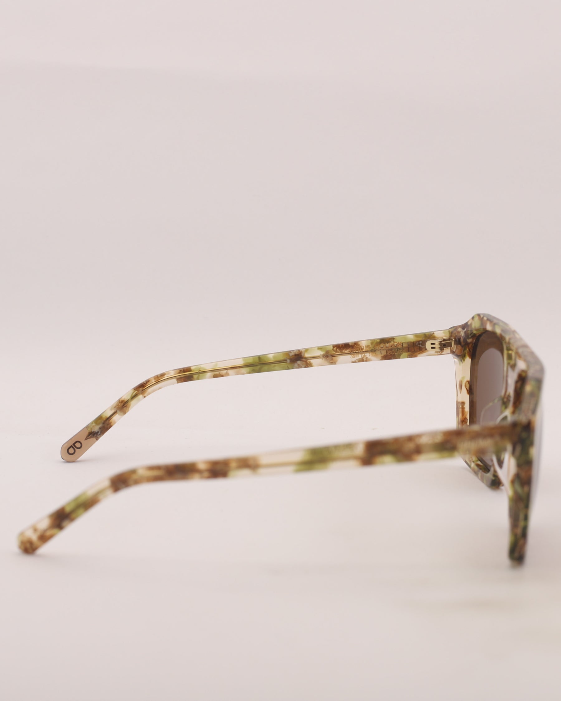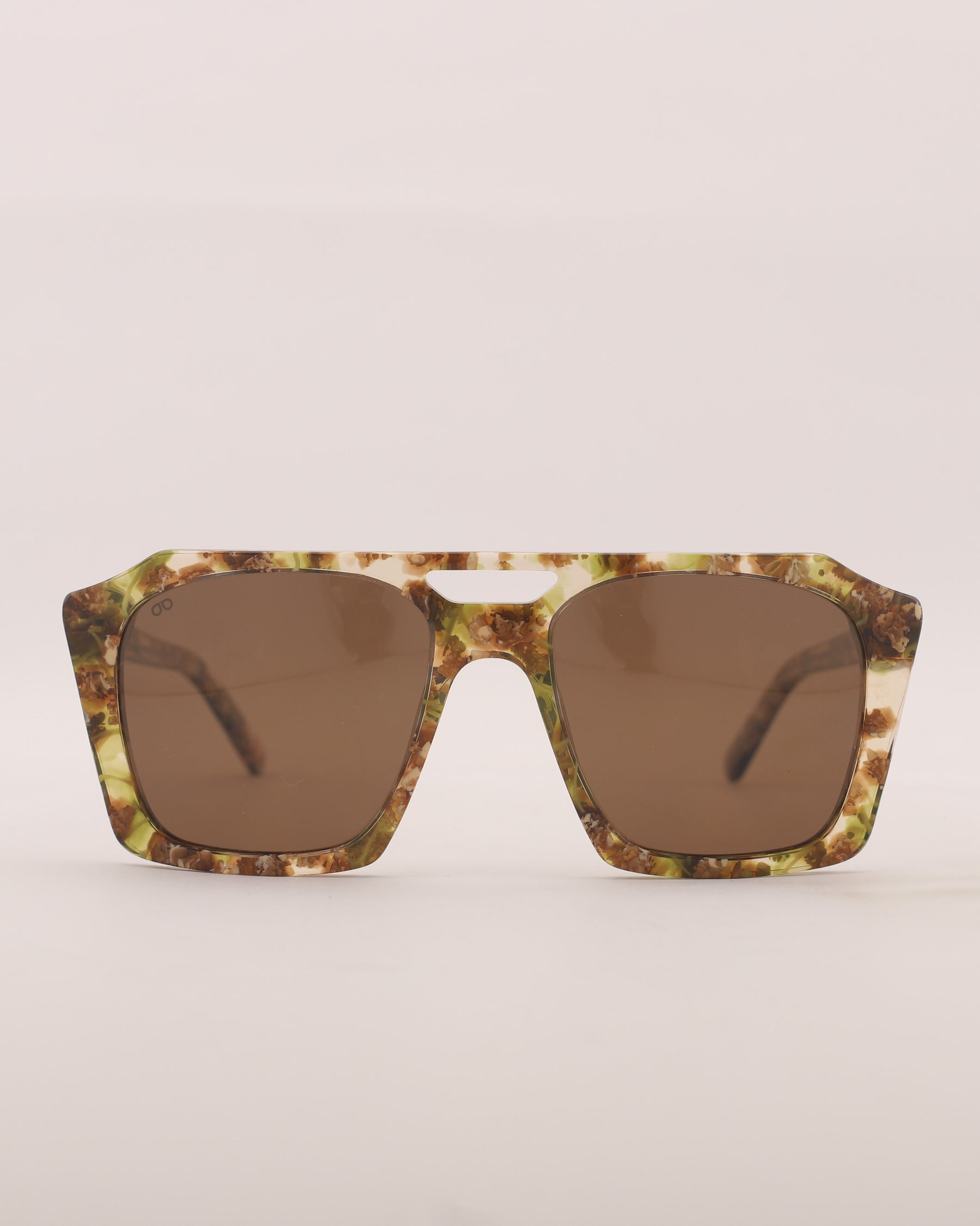 Lentes de sol fabricados en acetato con frente y patillas carey con betas verde brillo. Cristal sepia compacto con protección UV 400 y polarizado.