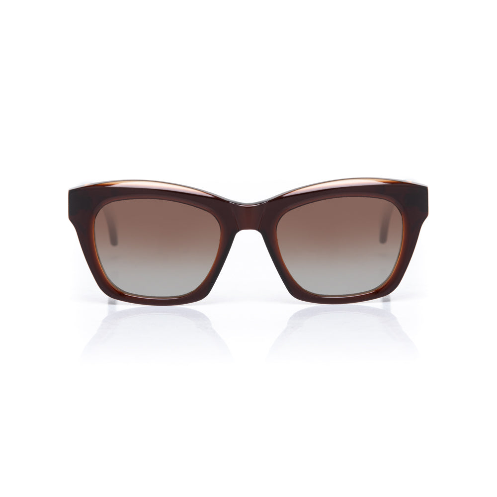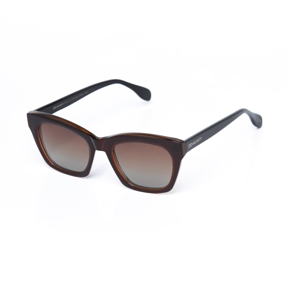 Lentes de sol fabricados en acetato con frente marrón brillo y patilla negro brillo. Cristal sepia degradé con protección UV 400 y polarizado.