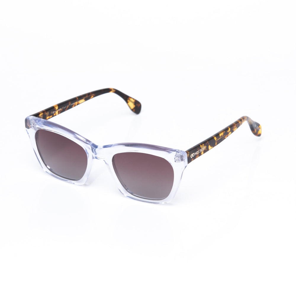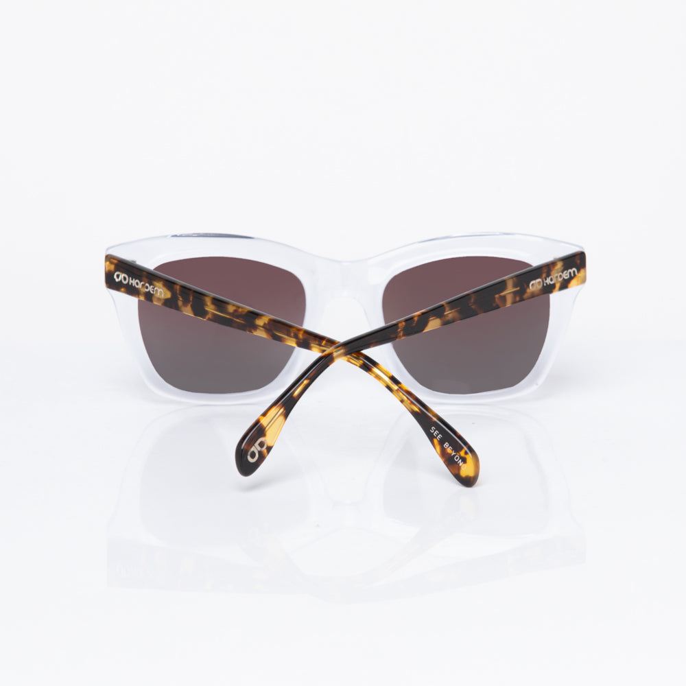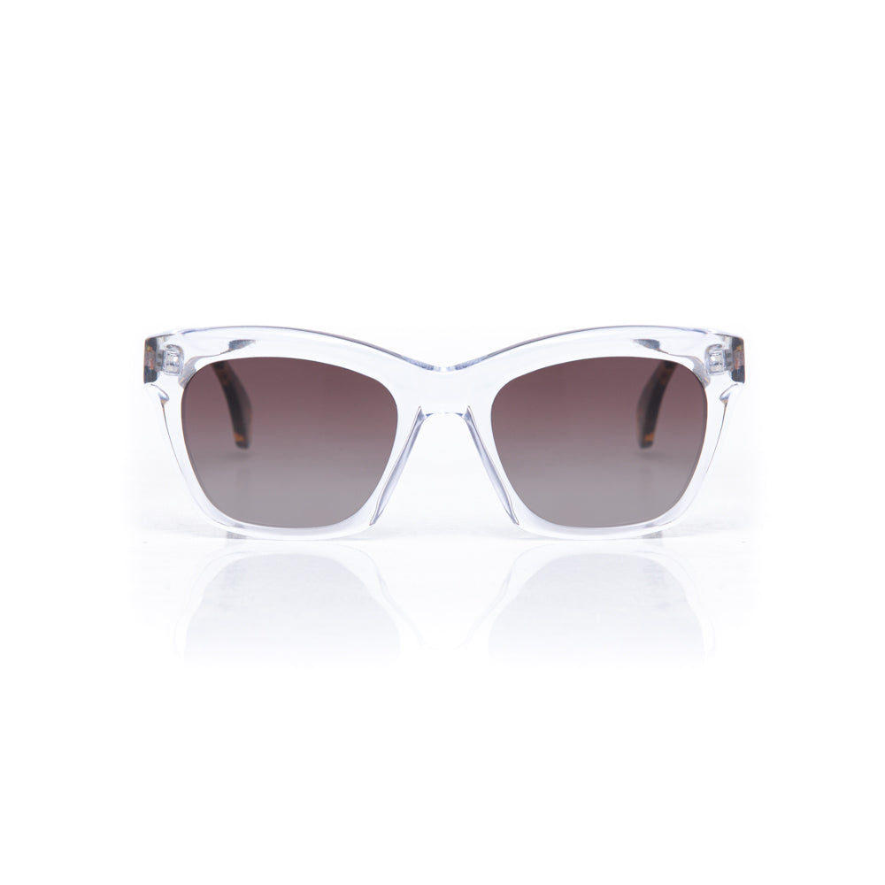 Lentes de sol fabricados en acetato con frente transparente brillo y patilla carey brillo. Cristal sepia degradé con protección UV 400 y polarizado.