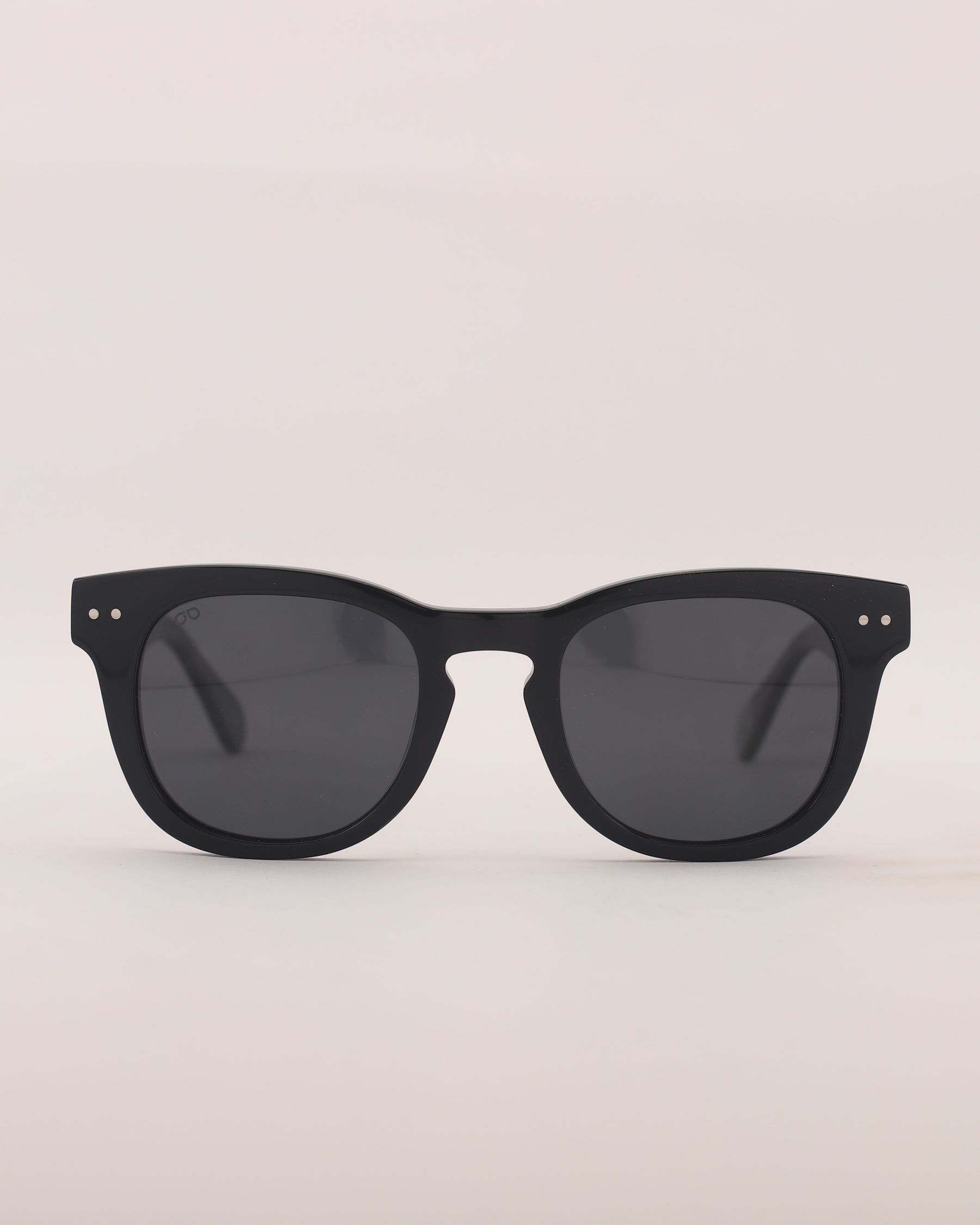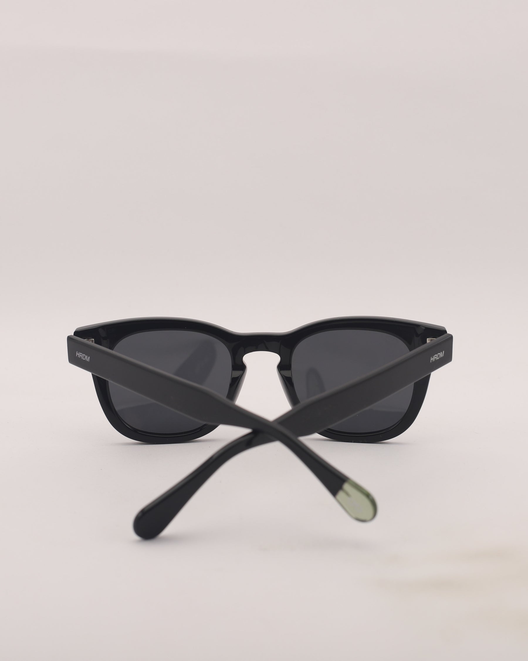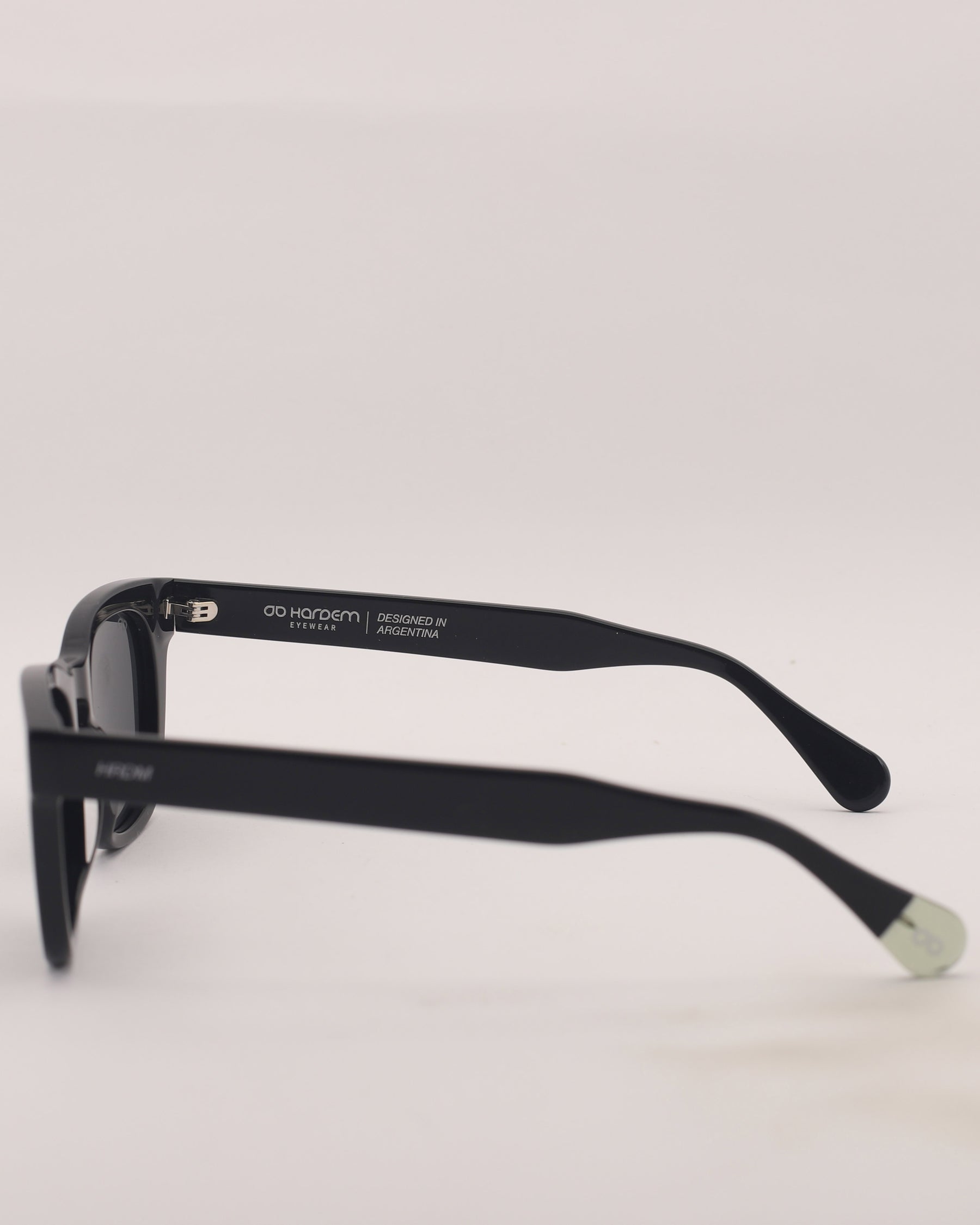 Lentes de sol fabricados en acetato con frente y patillas negro brillo. Cristal gris compacto con protección UV 400 y polarizado.