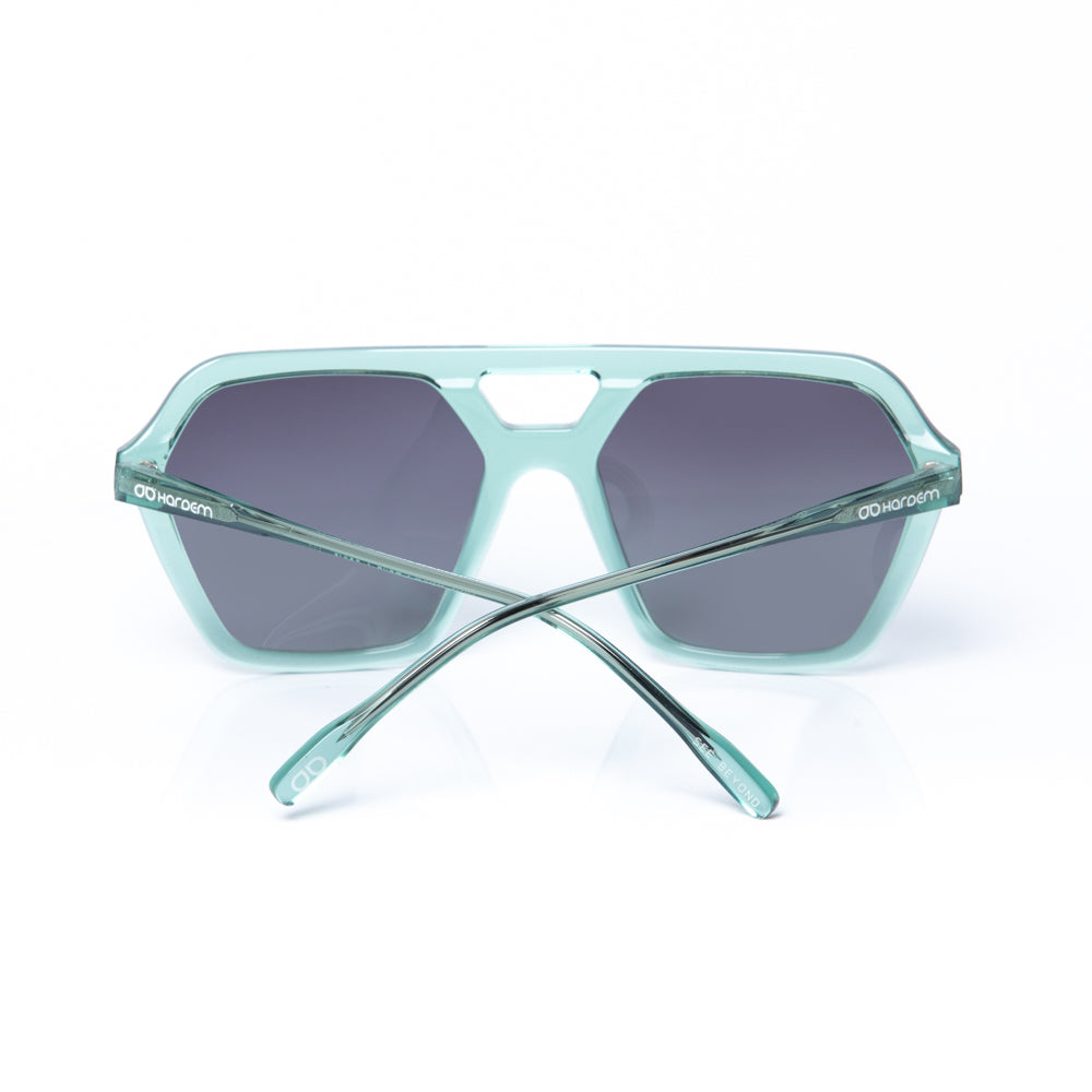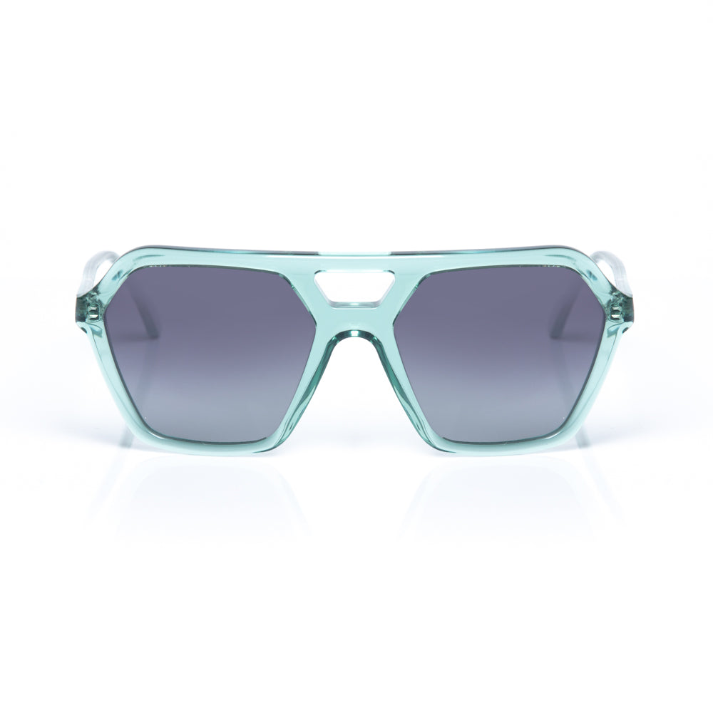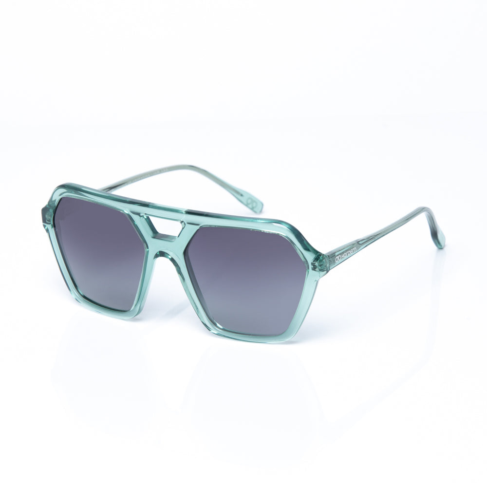 Lentes de sol fabricados en acetato con frente y patilla verde translúcido brillo. Cristal gris degradé con protección UV 400 y polarizado.