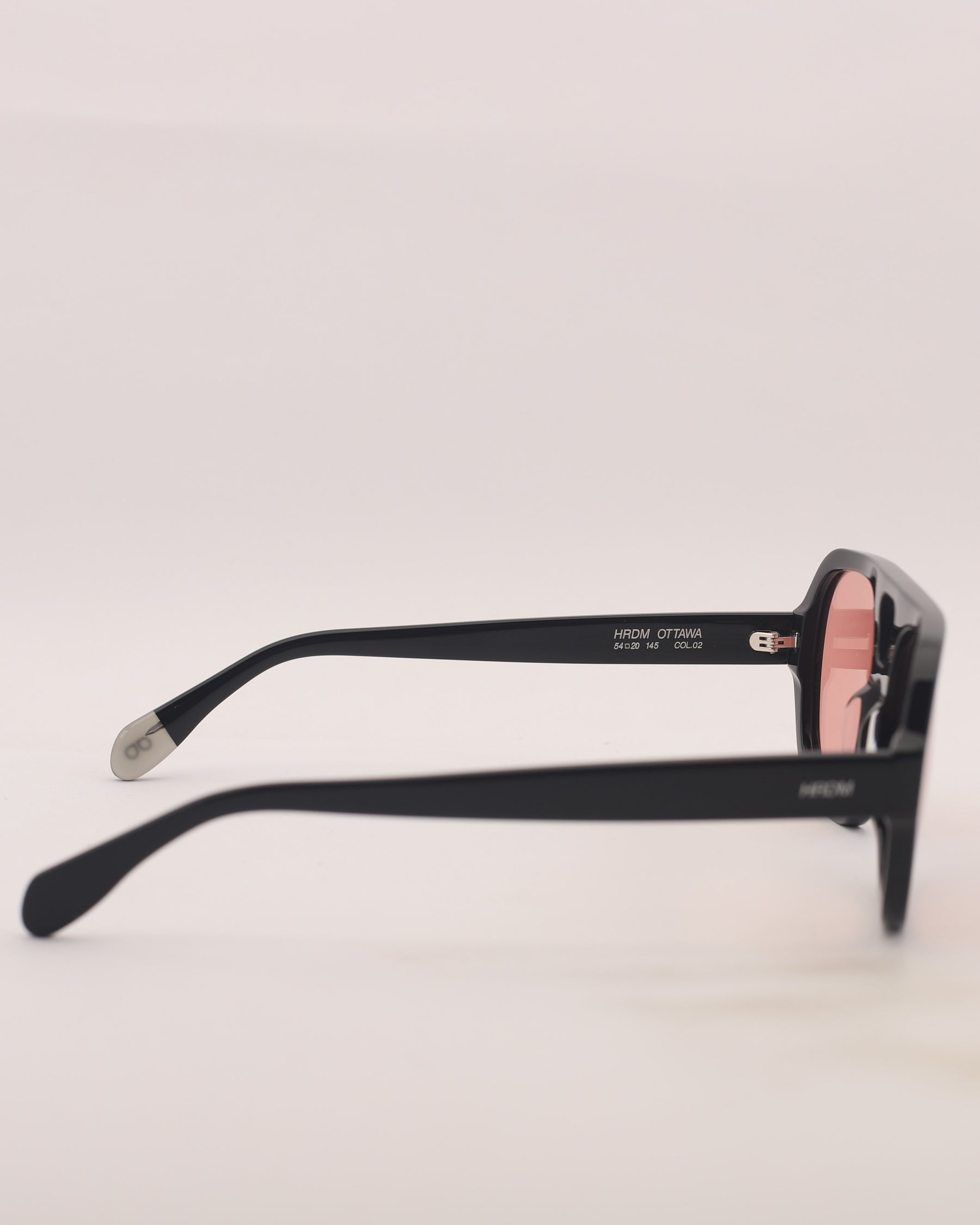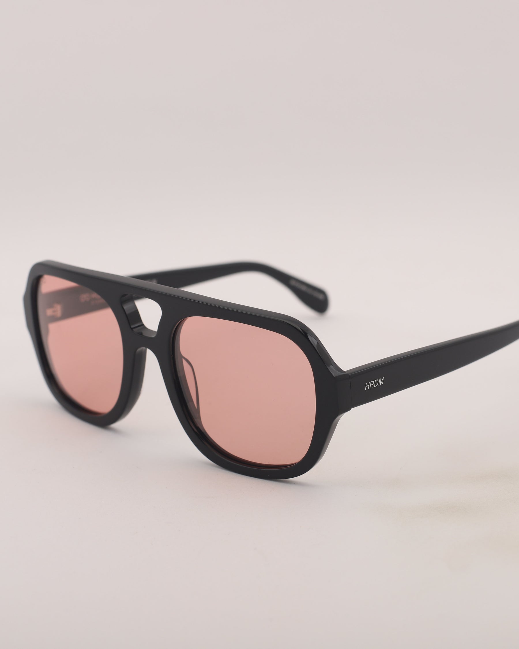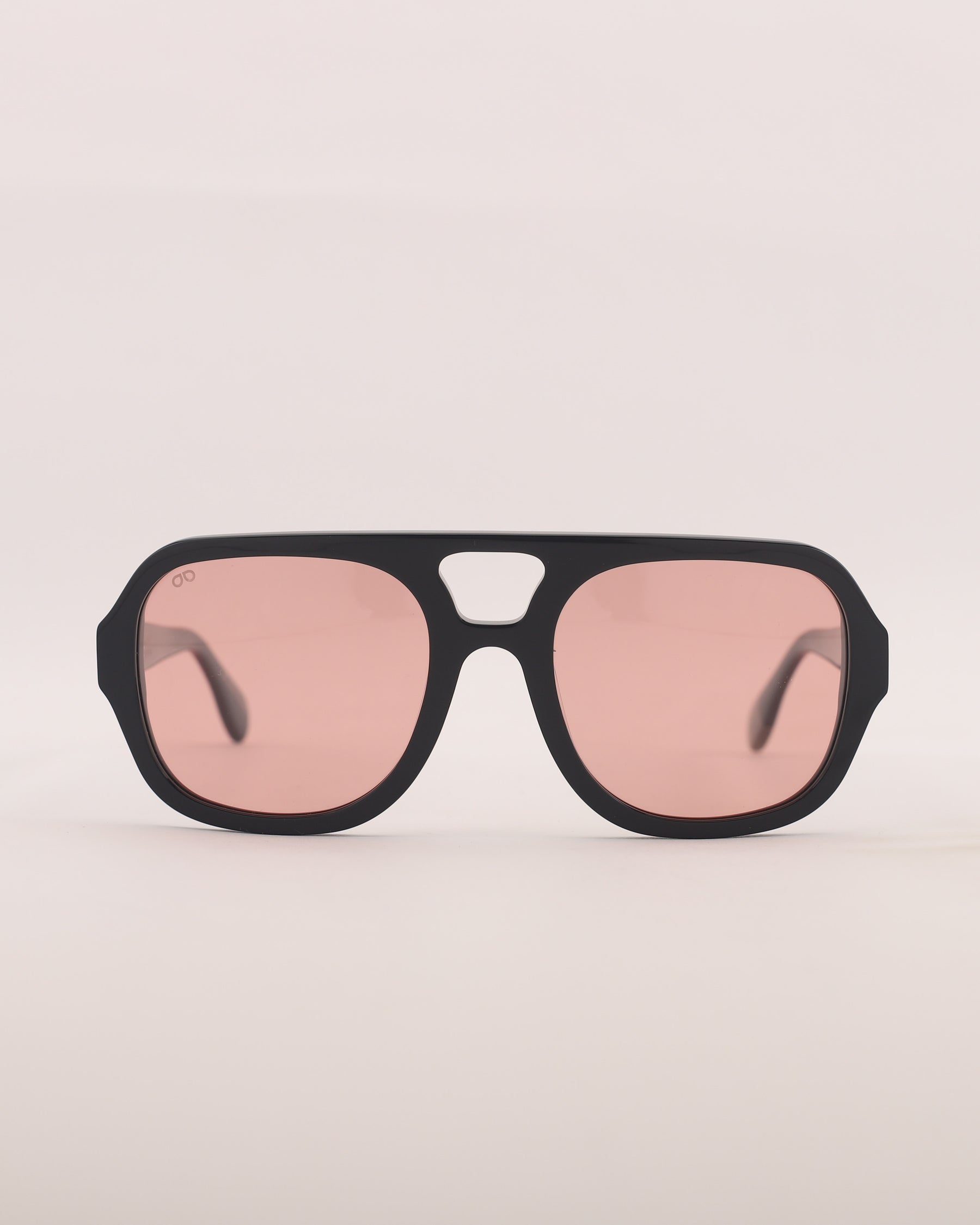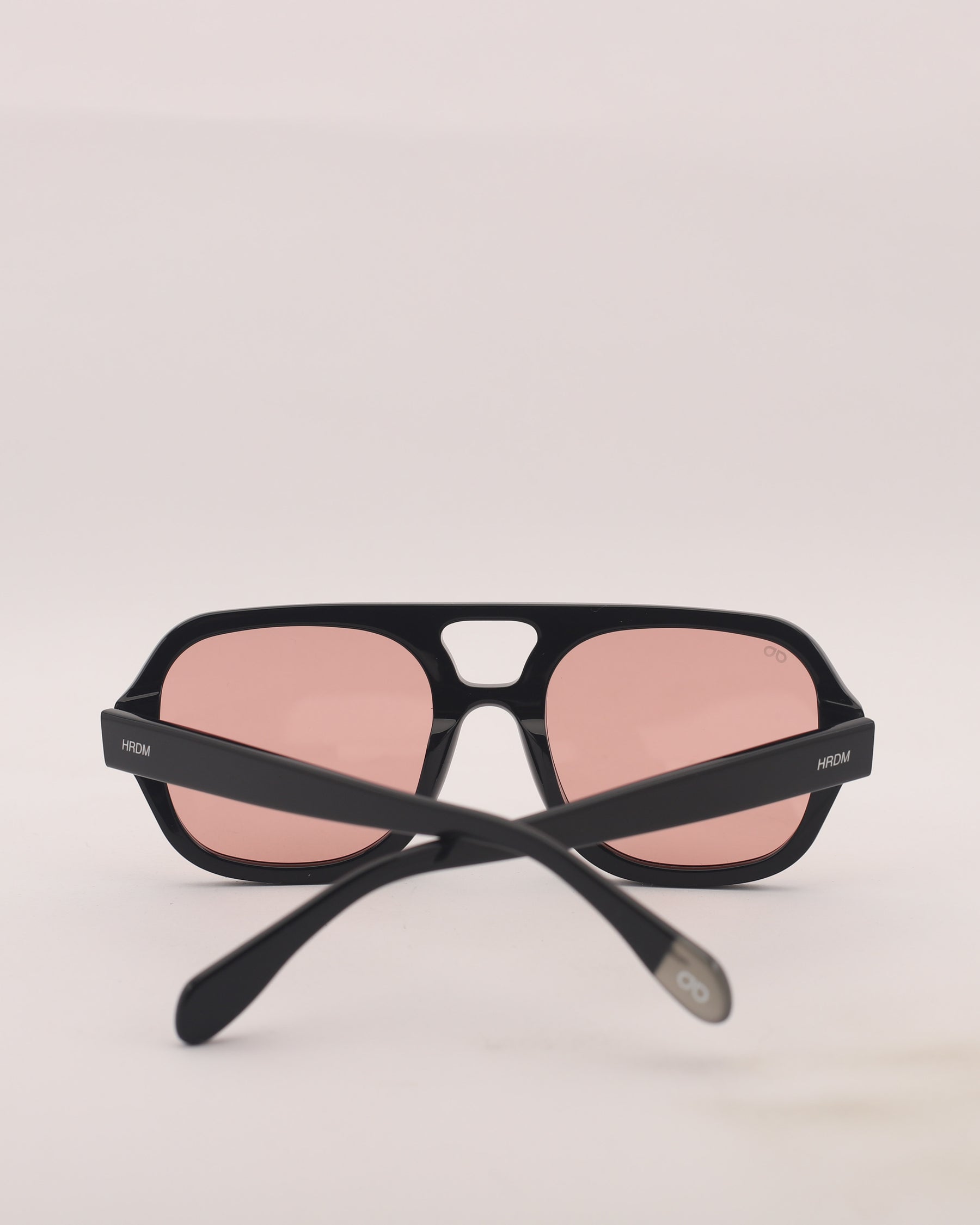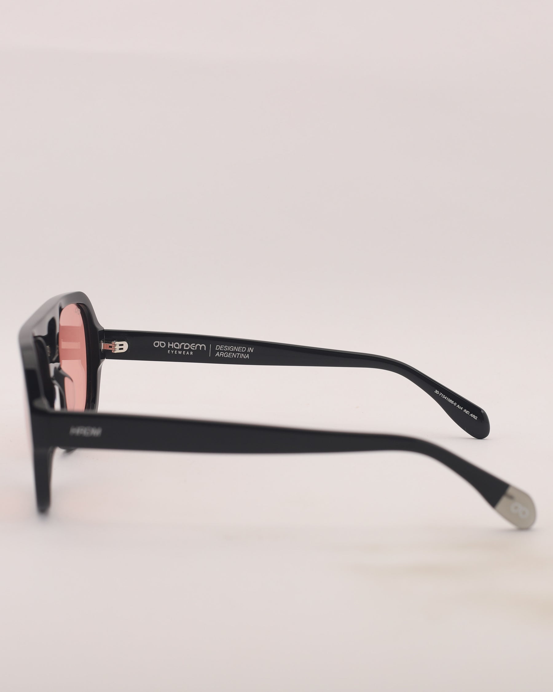 Lentes de sol fabricados en acetato con frente y patillas negro brillo. Cristal rosa compacto compacto con protección UV 400 y polarizado.