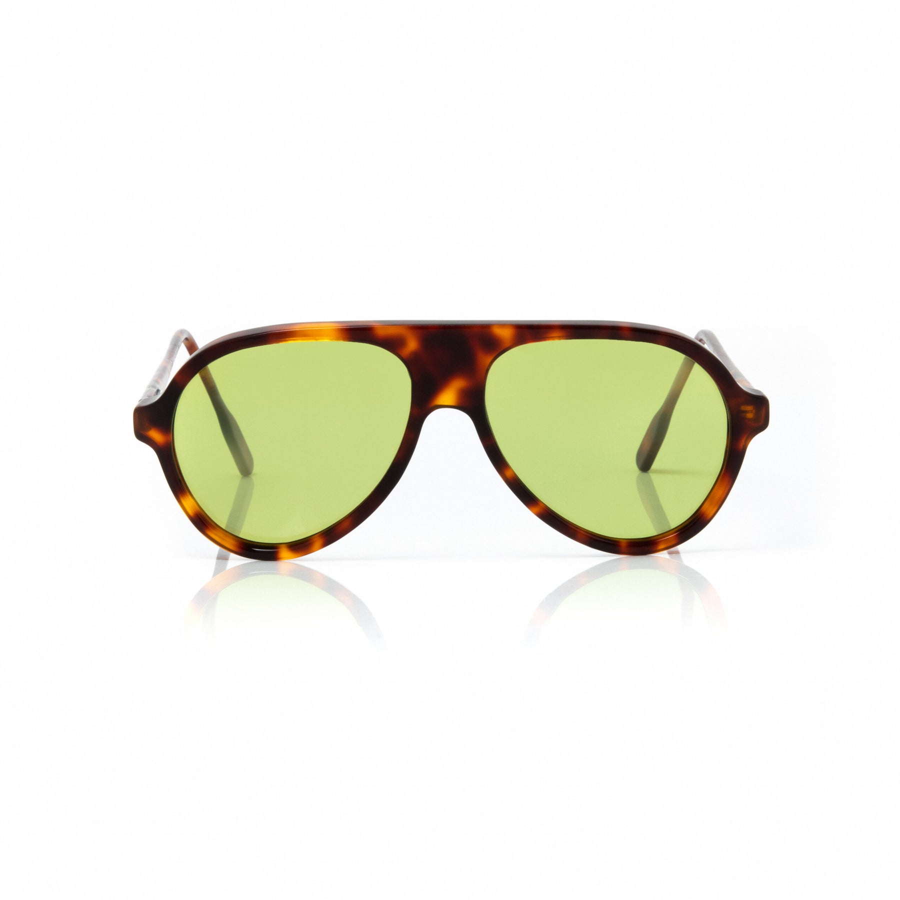 Lentes de sol fabricados en acetato con frente y patilla carey brillo. Cristal verde G-15 compacto con protección UV 400 y polarizado.