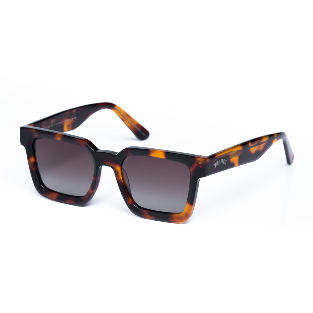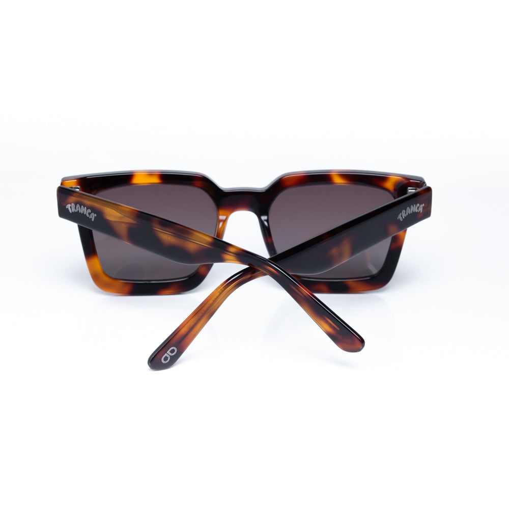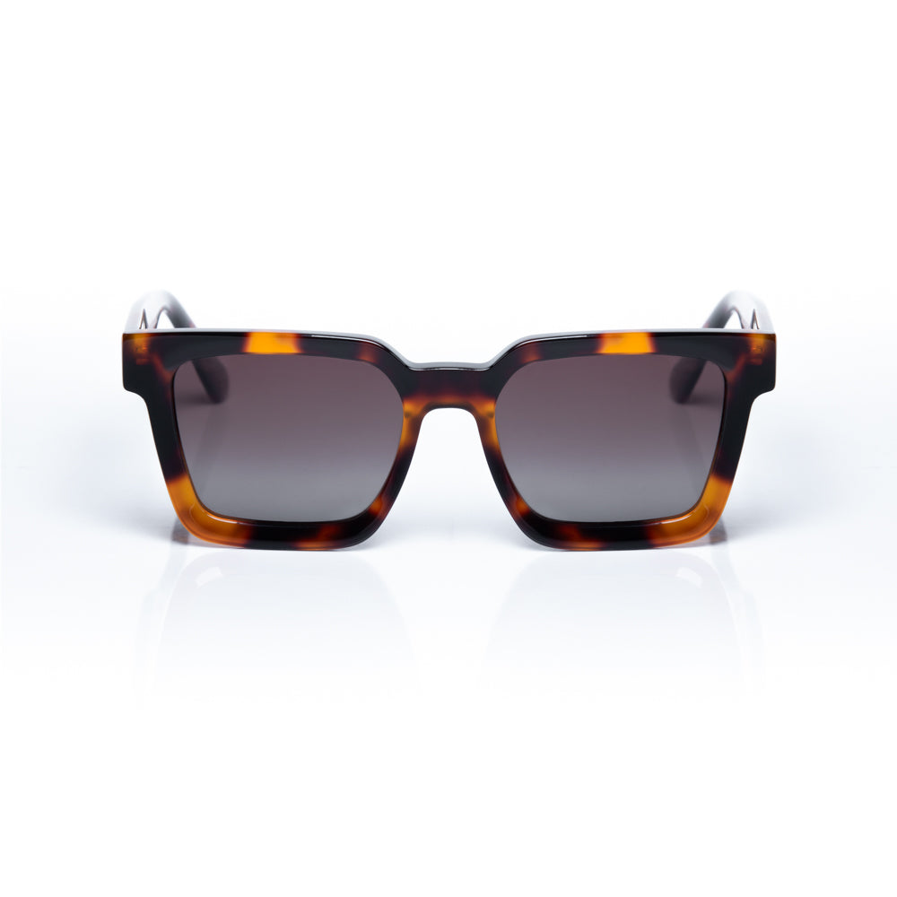 Lentes de sol fabricados en acetato con frente y patillas carey brillo. Cristal sepia degradé con protección UV 400 y polarizado. Modelo genderless & ageless.