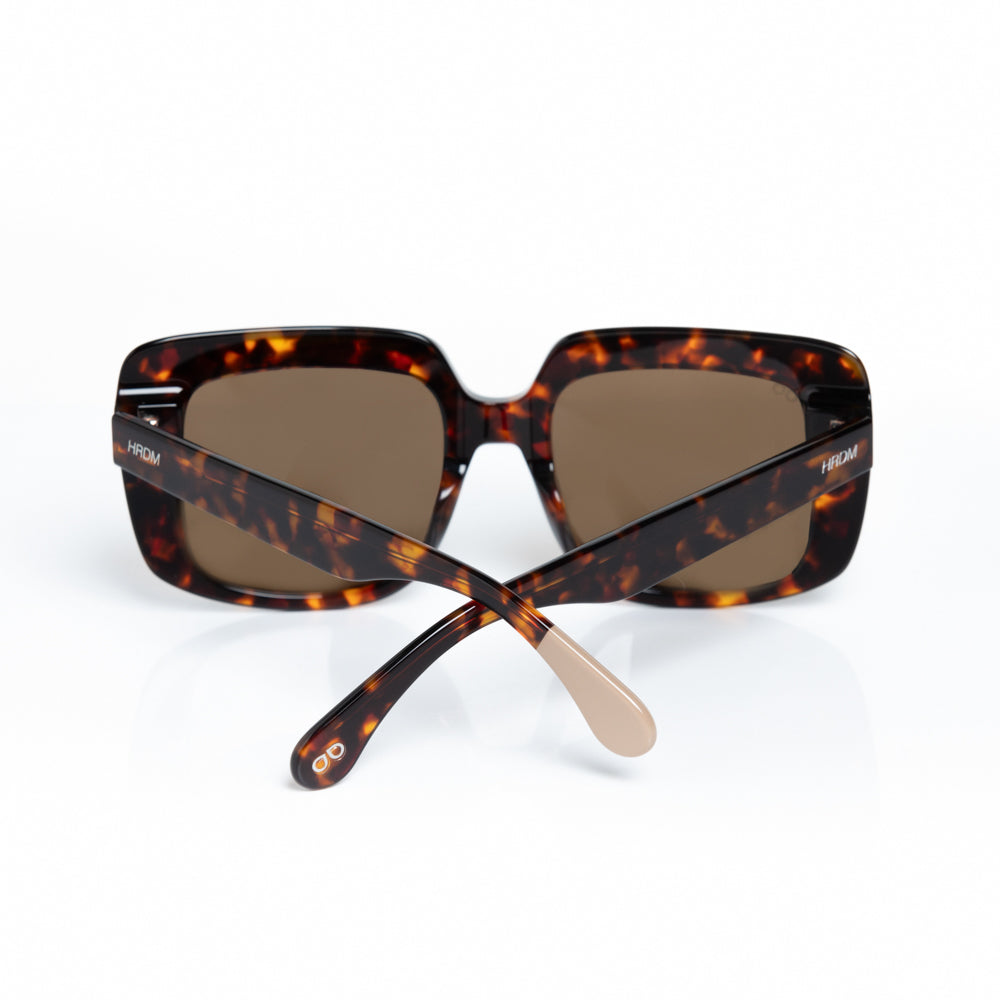 Lentes de sol fabricados en acetato con frente y patillas carey brillo. Detalles de diseño en patillas. Cristal sepia compacto con protección UV 400 y polarizado.