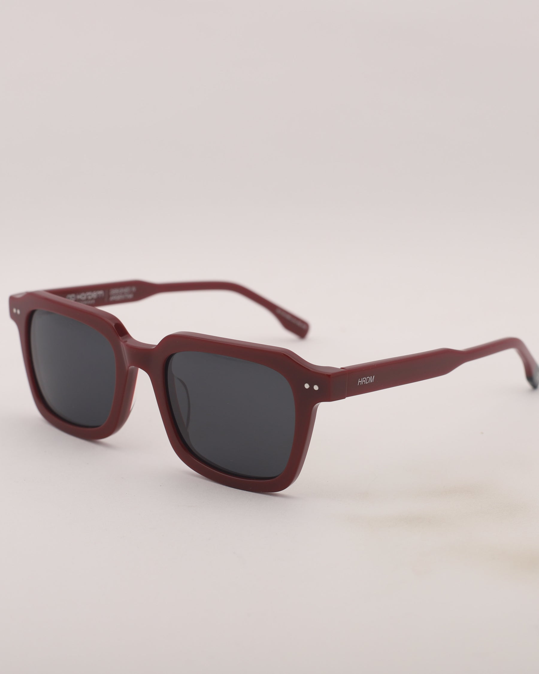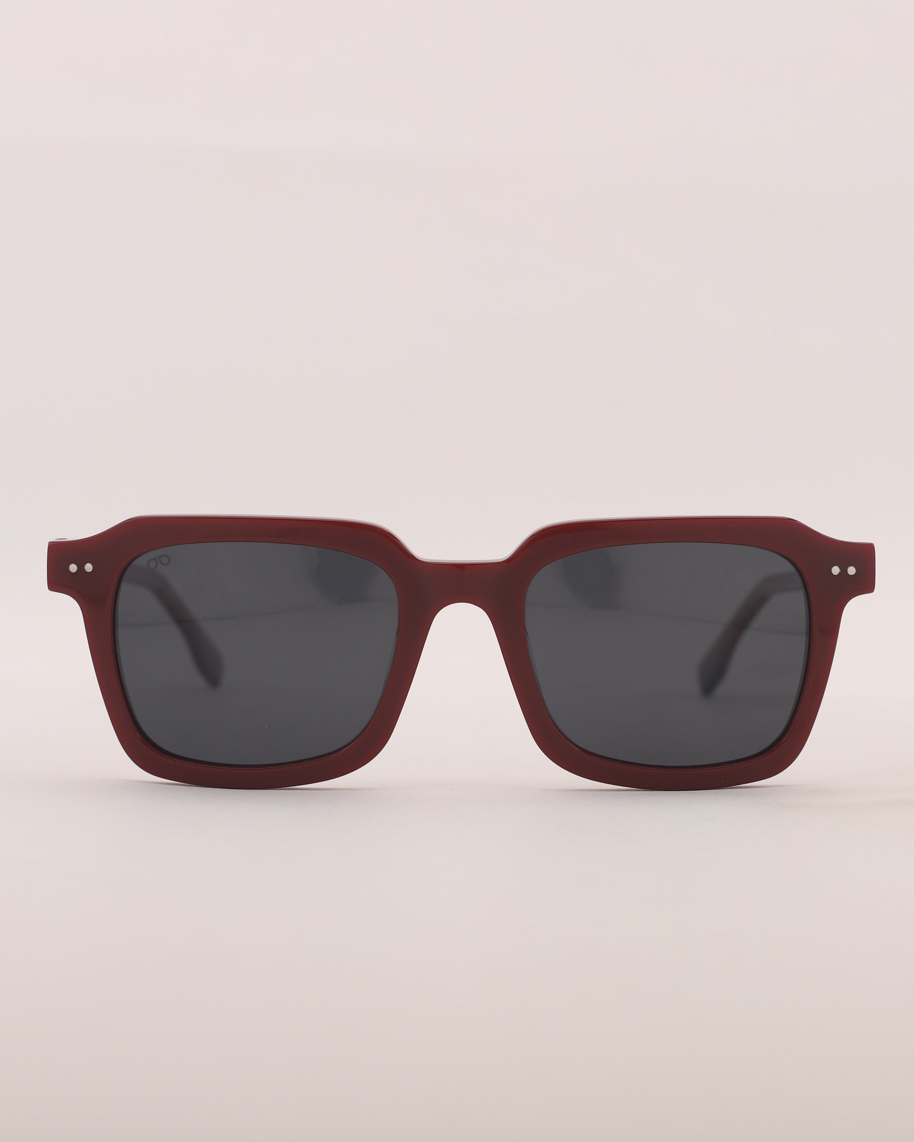 Lentes de sol fabricados en acetato con frente y patillas bordó brillo. Cristal gris compacto con protección UV 400 y polarizado.