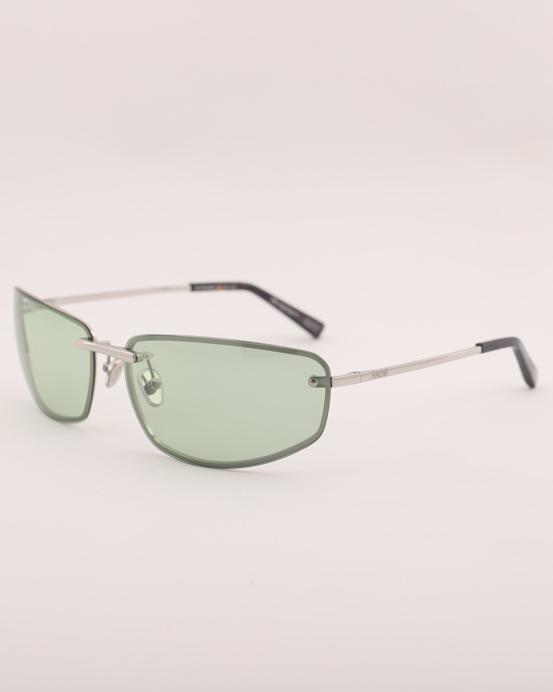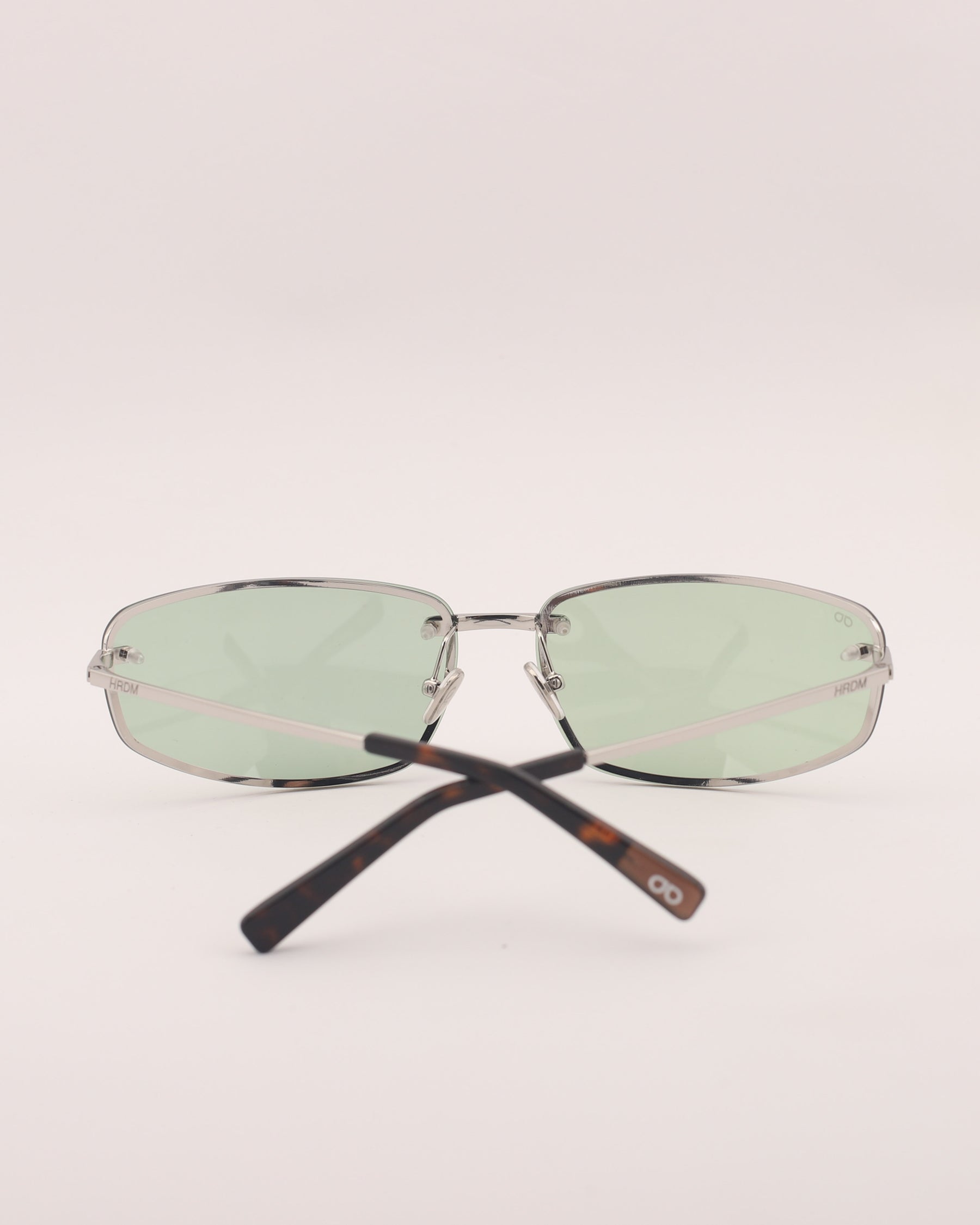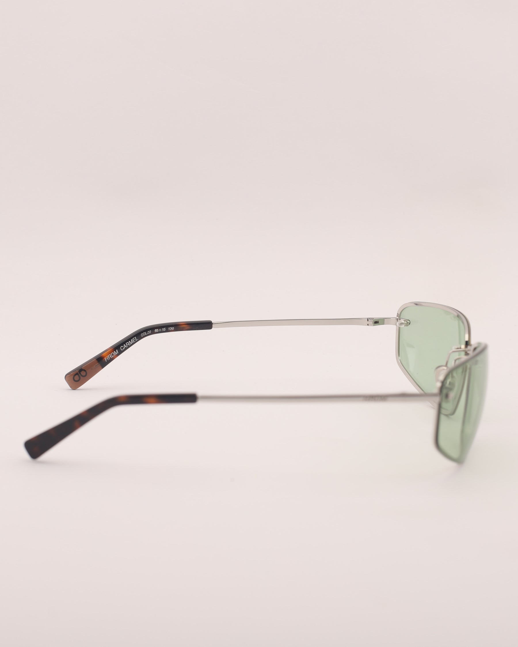 Lentes de sol fabricados en metal con frente y patilla plateado brillo. Cristal verde claro compacto con protección UV 400 y polarizado.