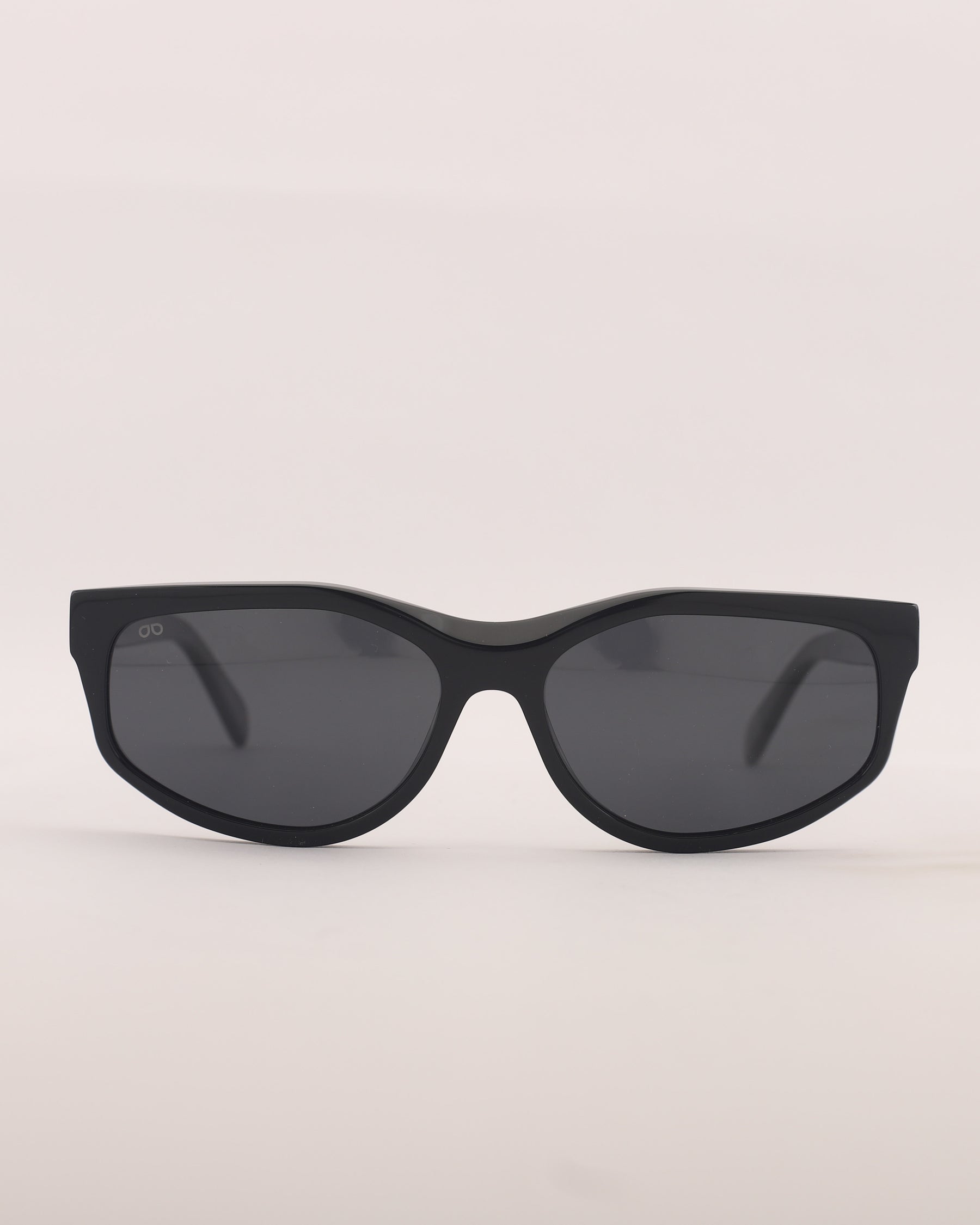 Lentes de sol fabricados en acetato con frente y patillas negro brillo. Cristal gris compacto con protección UV 400 y polarizado.