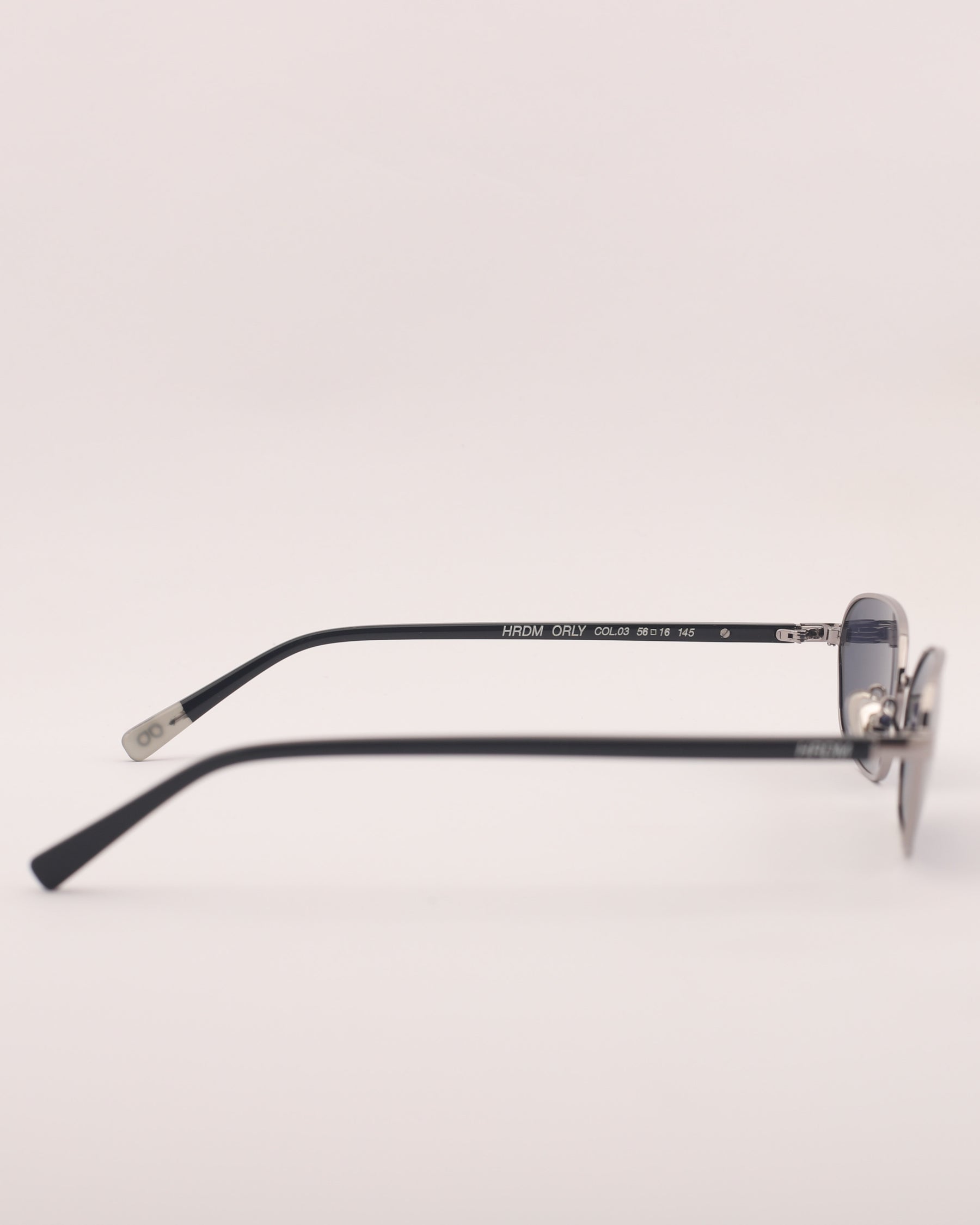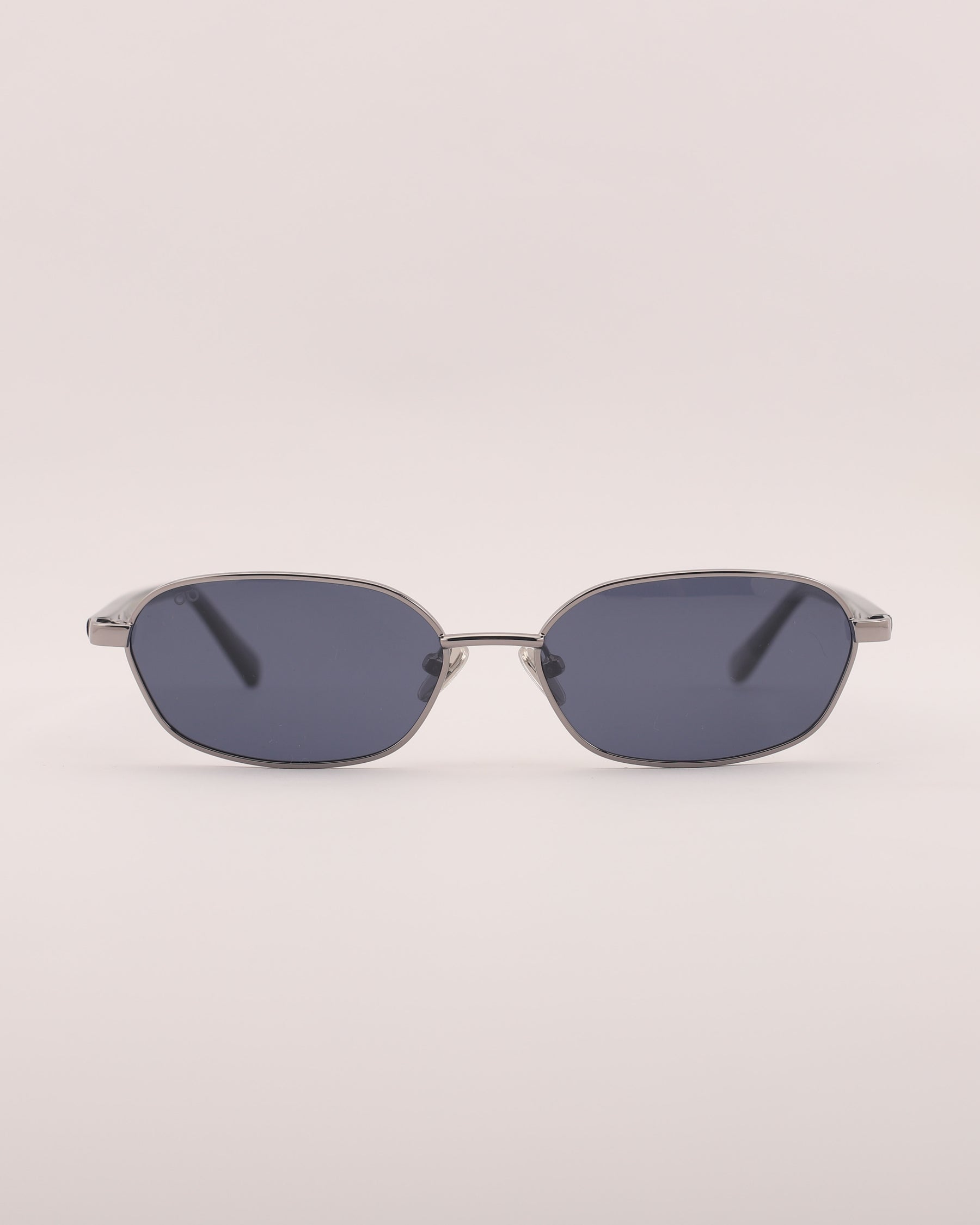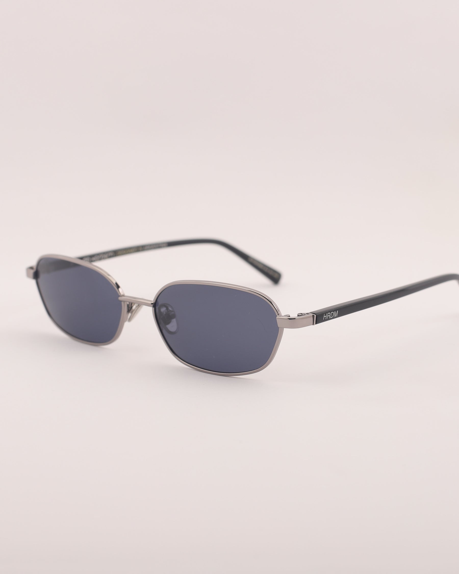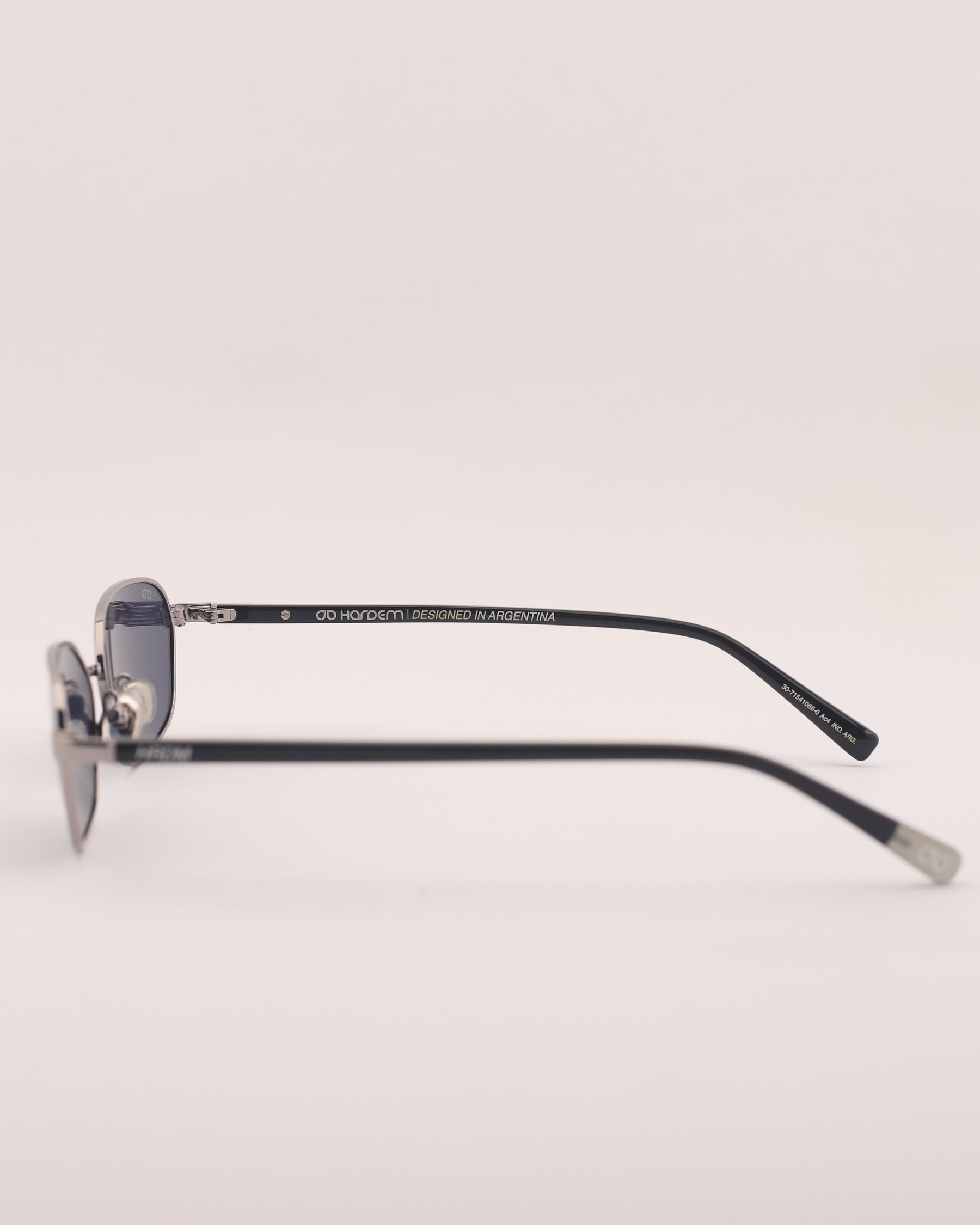 Lentes de sol fabricados en metal con frente gun metal brillo y patilla negro brillo. Cristal gris azulado compacto con protección UV 400 y polarizado.