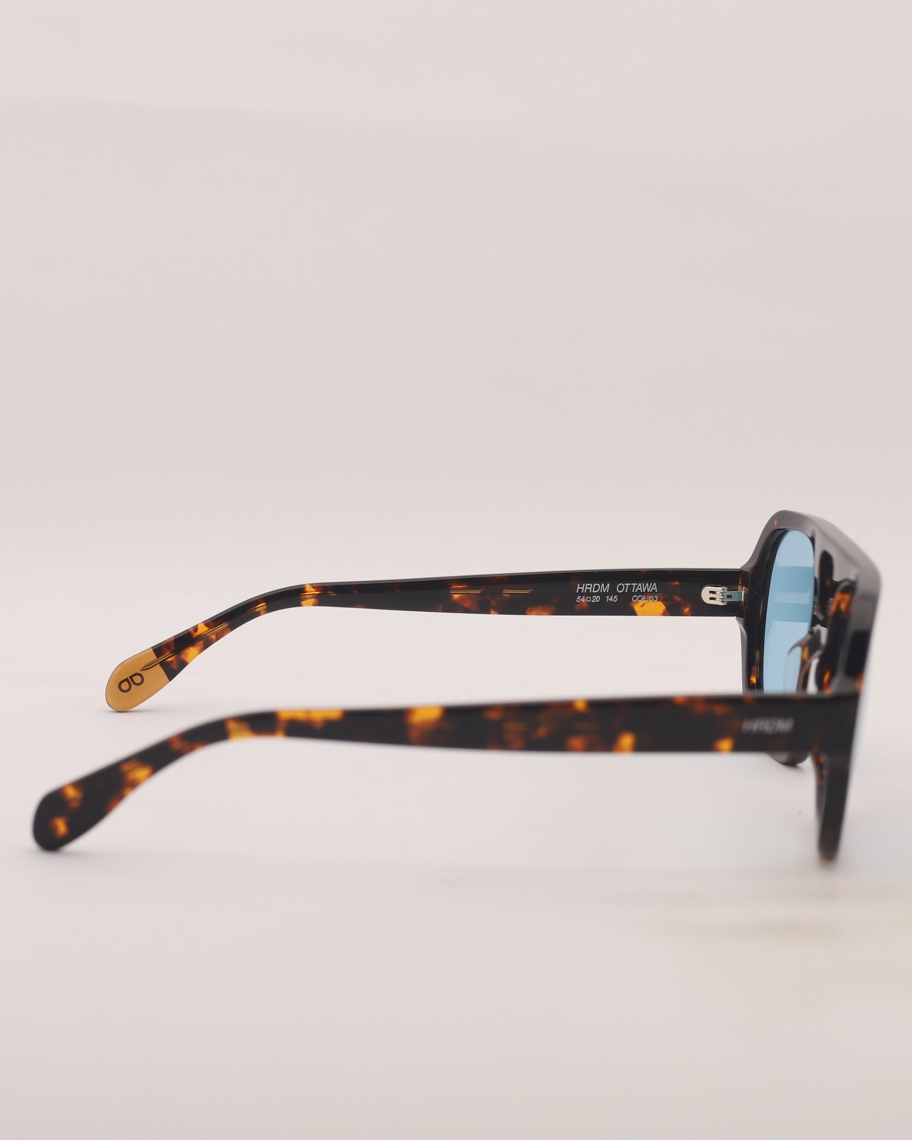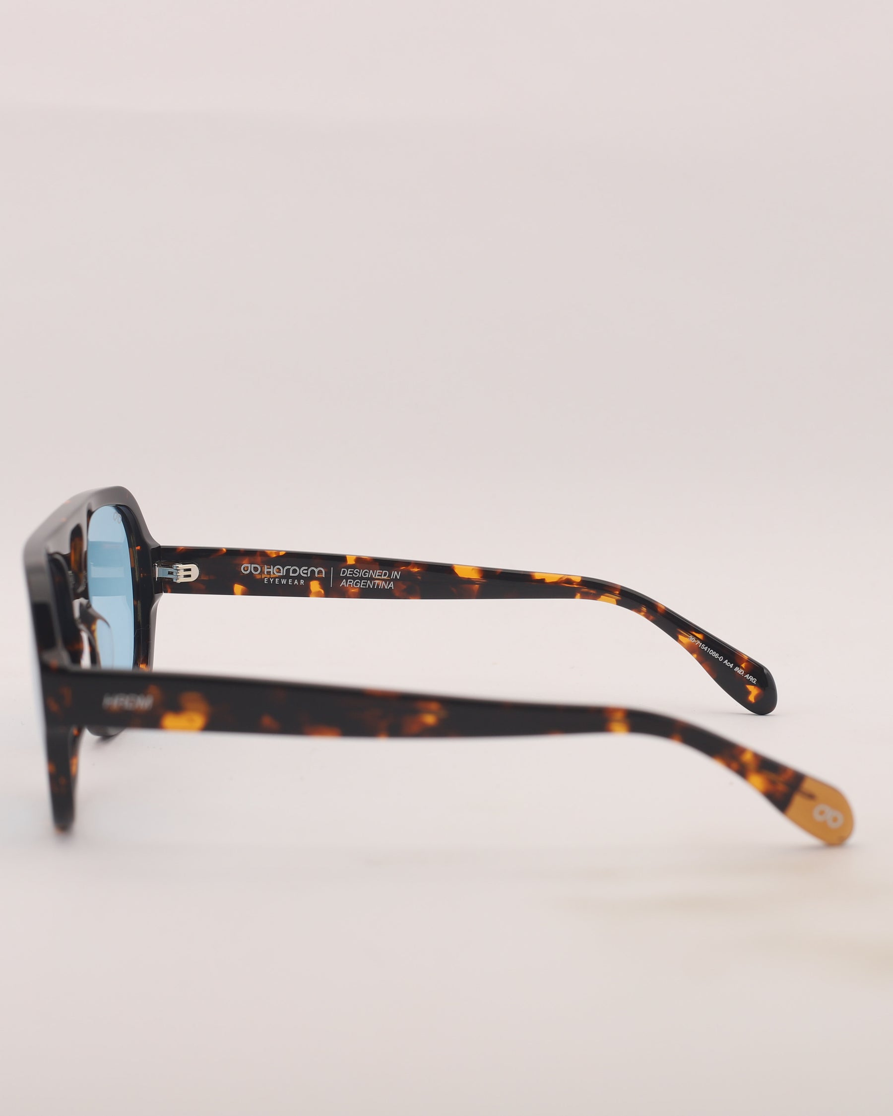 Lentes de sol fabricados en acetato con frente y patillas carey brillo. Cristal celeste compacto con protección UV 400 y polarizado.