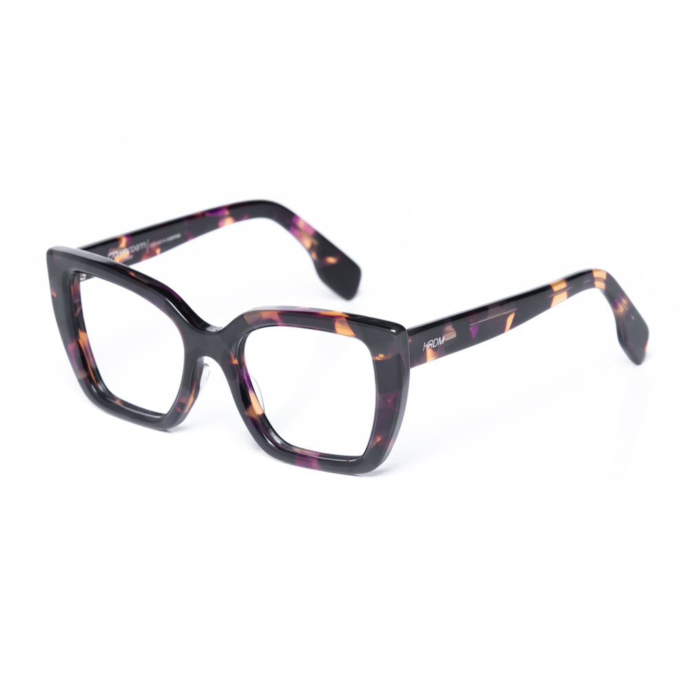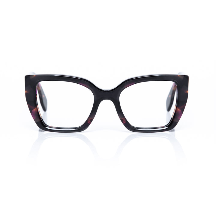 Marco de receta fabricado en acetato con frente y patillas carey con vetas violetas brillo. Lentilla de presentación transparente.